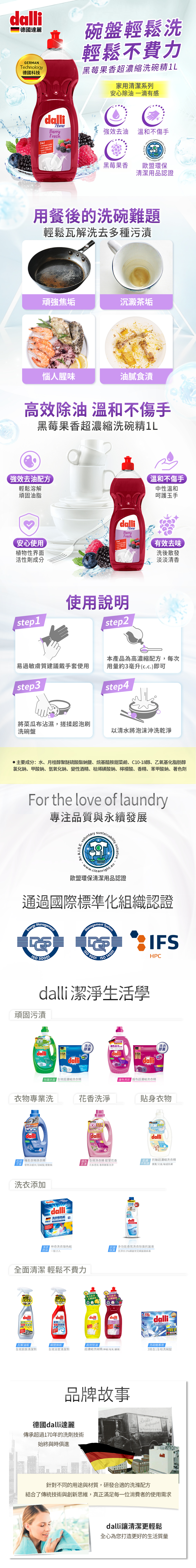 產品特色德國專業超濃縮配方,高效去除碗盤油污,讓您的碗盤潔淨光亮;植萃潔淨成分,好沖洗不傷手,溫和不刺激肌膚,散發黑莓果甜香。