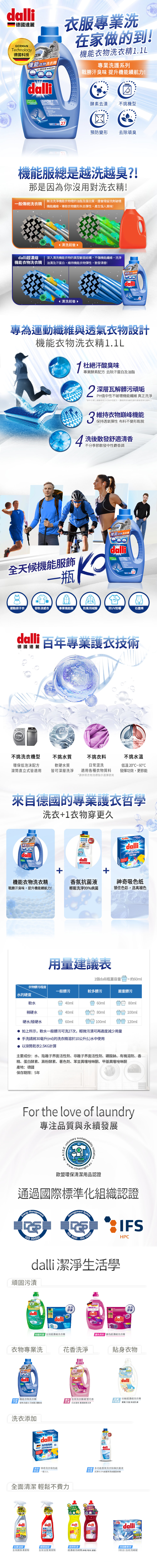 | 商品說明 | 專為現代運動彈性纖維及機能與透氣衣料所設計的洗衣精。 能深入纖維衣料內部徹底洗淨,去除異味,並保持衣物的形狀與彈性。 通過歐盟A.I.S.E環保清潔用品認證,軟硬水皆適用。 |