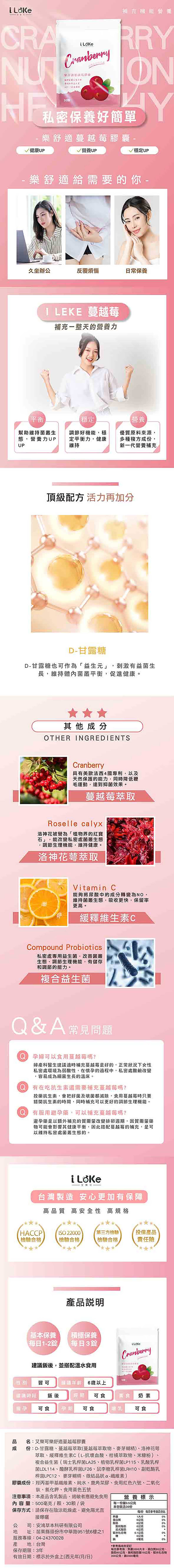成分:D-甘露糖、蔓越莓萃取(蔓越莓萃取物、麥芽糊精)、洛神花萼萃取、緩釋維生素C(L-抗壞血酸、柑橘萃取物、米糠粉)、、複合益生菌(瑞士乳桿菌 LA25、植物乳桿菌LP115、乳酸乳桿菌LDL114、醱酵乳桿菌LF26、鼠李糖 乳桿菌LRH10、副乾酪乳桿菌LPC12、 麥芽糊精、微結晶狀α-纖維素)