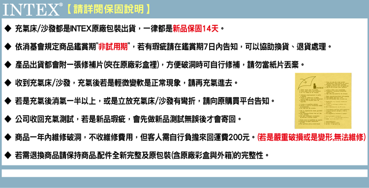 ◆ 充氣床/沙發屬消耗品,使用壽命依個人使用有所不同,新品保固14天,破洞保修一年。