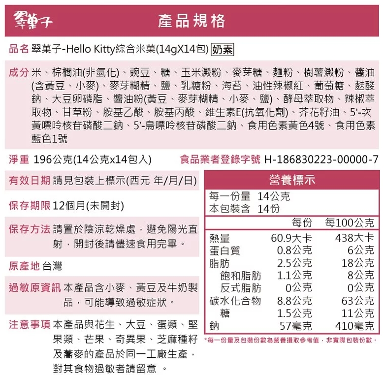 米、棕櫚油(非氫化)、豌豆、糖、玉米澱粉、麥芽糖、麵粉、樹薯澱粉、醬油(含黃豆、小麥)、麥芽糊精、鹽、乳糖粉、海苔、油性辣椒紅、葡萄糖、麩酸鈉、大豆卵磷脂、醬油粉(黃豆、麥芽糊精、小麥、鹽)、酵母萃取物、辣椒萃取物、甘草粉、胺基乙酸、胺基丙酸、維生素E(抗氧化劑)、芥花籽油、5'–次黃嘌呤核苷磷酸二鈉、5 '–鳥嘌呤核苷磷酸二鈉、食用色素黃色4號、食用色素藍色1號