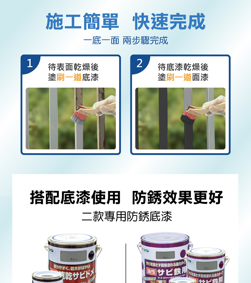 4.已生銹或濕氣重及室外鐵製品須先加塗本品牌的防銹(或止銹)底漆(另購)隔1~2日(冬天隔2~3天)再重塗一次。