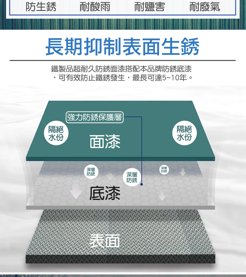 ●含強力防銹劑,能長期防銹。室外鐵器均須先加塗底漆,防銹效期可達5-10年