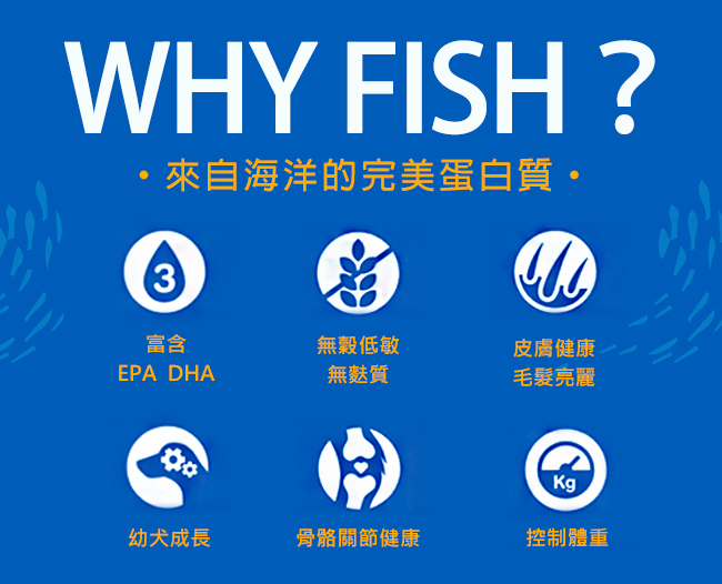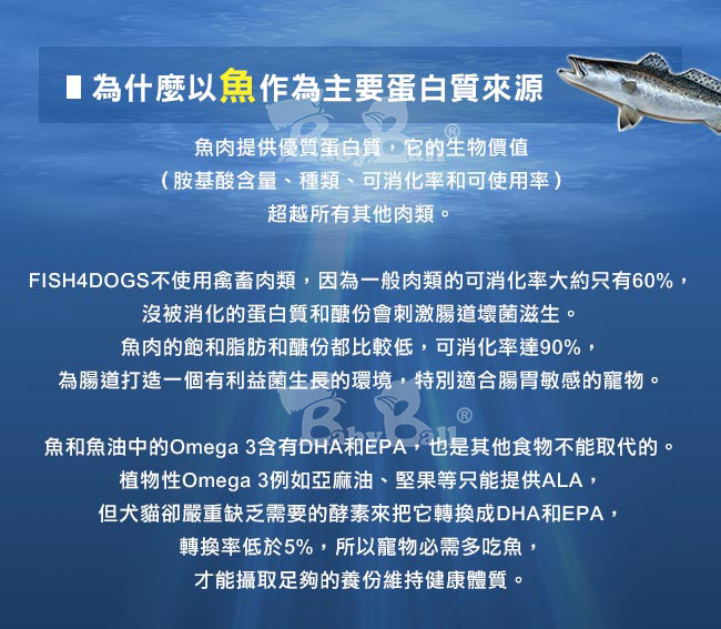 FISH4DOGS不使用禽畜肉類,因為一般肉類的可消化率大約只有60%,沒被消化的蛋白質和醣份會刺激腸道壞菌滋生。魚肉的飽和脂肪和醣份都比較低,可消化率達90%,為腸道打造一個有利益菌生長的環境,特別適合腸胃敏感的寵物。