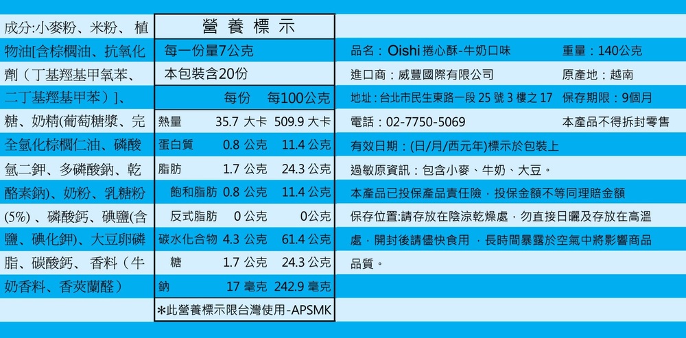 過敏原資訊:本產品含有小麥、牛奶、大豆。