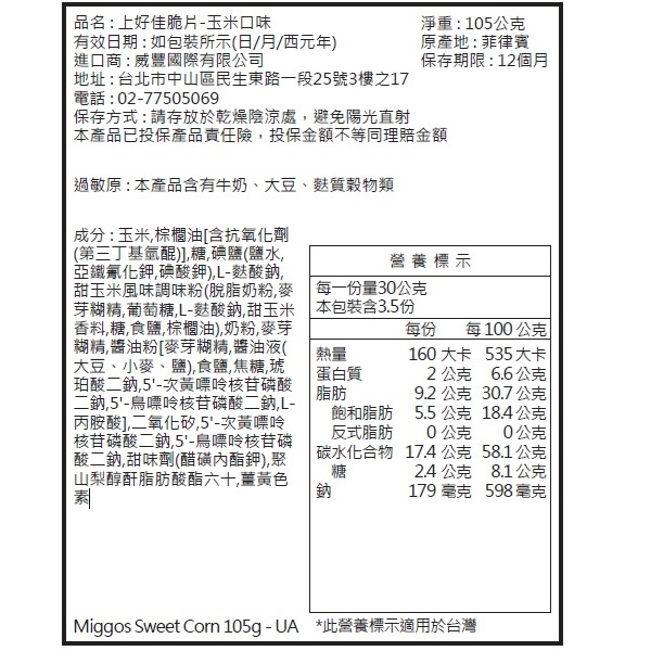 商品規格:105g/包 商品重(容)量:105g 內容物成分:玉米,棕櫚油[含抗氧化劑(第三丁基氫醌)],糖,碘鹽(鹽水,亞鐵氰化鉀,碘酸鉀),L-麩酸鈉,甜玉米風味調味粉(脫脂奶粉,麥芽糊精,葡萄糖,L-麩酸鈉,甜玉米香料,糖,食鹽,棕櫚油),奶粉,麥芽糊精,醬油粉[麥芽糊精,醬油液(大豆,小麥,鹽),食鹽,焦糖,琥珀酸二鈉,5'-次黃嘌呤核苷磷酸二鈉,5'-鳥嘌呤核苷磷酸二鈉,L-丙胺酸],二氧化矽,5'-次黃嘌呤核苷磷酸二鈉,5'-鳥嘌呤核苷磷酸二鈉,甜味劑(醋磺內酯鉀),聚山梨醇酐脂肪酸酯六十,薑黃色素。 食品添加物成分:第三丁基氫醌,亞鐵氰化鉀,碘酸鉀),L-麩酸鈉,麥芽糊精,琥珀酸二鈉,5'-次黃嘌呤核苷磷酸二鈉,5'-鳥嘌呤核苷磷酸二鈉,二氧化矽,5'-次黃嘌呤核苷磷酸二鈉,5'-鳥嘌呤核苷磷酸二鈉,醋磺內酯鉀,聚山梨醇酐脂肪酸酯六十。 產地:菲律賓 保存期限:12個月 保存方法:如包裝所示 注意事項:如包裝所示 製造廠商或國內負責廠商名稱:威豐國際有限公司 製造廠商或國內負責廠商電話:02-7750-5069 製造廠商或國內負責廠商地址:台北市中山區民生東路一段25號3樓之17 食品業者登錄字號:A-150782752-00000-4 投保產品責任險字號:1722513ML001328 過敏原資料:本產品含有牛奶、大豆、麩質穀物類。 ◎ 製造日期與有效期限,商品成分皆標示於包裝盒上 ◎ 本產品網頁因拍攝關係,圖檔略有差異,實際以廠商出貨為主 ◎ 本產品文案若有變動敬請參照實際商品為準 ◎ 以消費者收受日算起,至少距有效日期前【30】日以上:依商品包裝標示,若收到小於30天可聯絡客服供退換貨