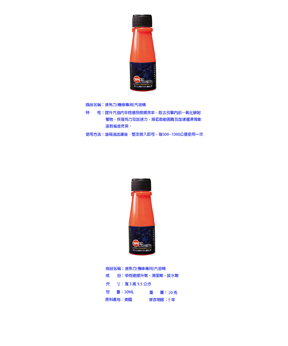 主要成份:辛烷值提昇劑、清潔劑、拔水劑。 商品尺寸:高9.5 直徑3 cm 商品容量:30ml 使用方法:油箱加滿後,整罐倒入即可, 每500公里使用一次。 適用車種:適用機車全車系,尤其五期環保噴射引擎車系更需天加 原料產地:美國 產地:台灣分裝 保存期限:五年 經銷商:坤垣企業有限公司 電話:02-22816056 製造商:豐全科技股份有限公司 地址: 新北市汐止區環河街200號2F 消費者服務專線:(02) 2692-6807◎ 製造日期與有效期限,商品成分皆標示於包裝盒上 ◎ 本產品網頁因拍攝關係,圖檔略有差異,實際以廠商出貨為主 ◎ 本產品文案若有變動敬請參照實際商品為準