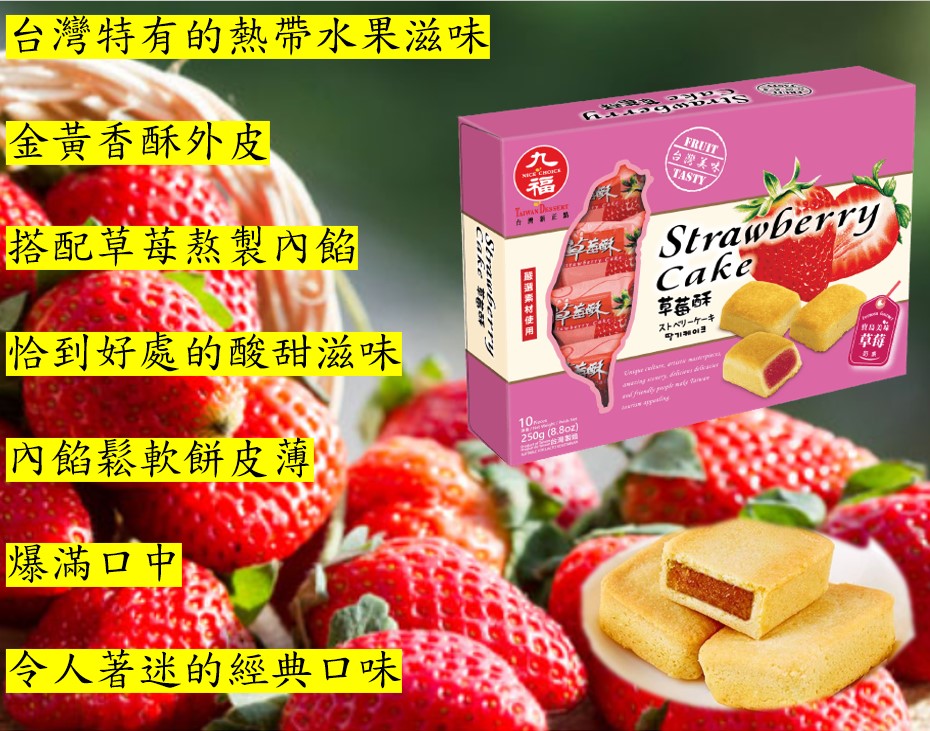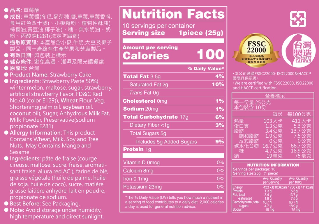 內容物名稱(成分):草莓醬(冬瓜.麥芽糖.糖.草莓.香料.食用紅色四十號)、小麥麵粉、植物性酥油(棕櫚油.黃豆油.椰子油)、糖、無水奶油、奶粉、馬鈴薯澱粉、丙酸鈉E281(法定防腐劑)、香料。