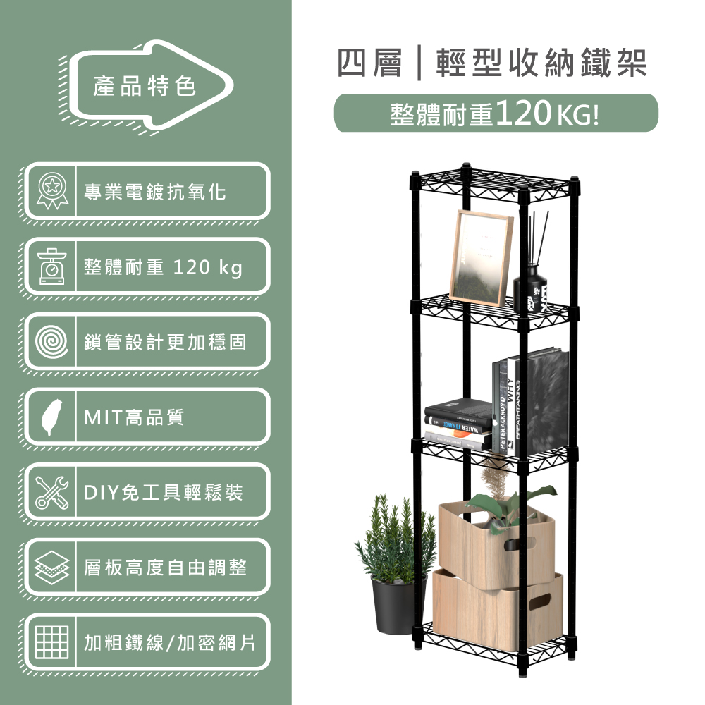 【商品規格】 ● 35x20 黑色四層架 |網片尺寸:35x20(cm) |內容物及數量:網片X4(片)、塑膠夾片X32(PCS) ● 鐵管規格 |高度 120CM:30下管X4(支)、30上管X12(支)、調整腳X4(個)、內塞X4(個)