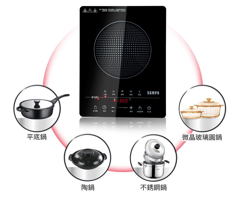 (1) 以熱傳導原理運作,不挑鍋具,適用玻璃、不鏽鋼、鋁、陶瓷、不沾鍋等材質。