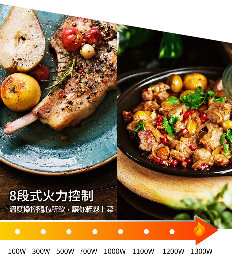 (3) 8段火力設定:100W/300W/500W/700W/1000W/1100W/1200W/1300W。
