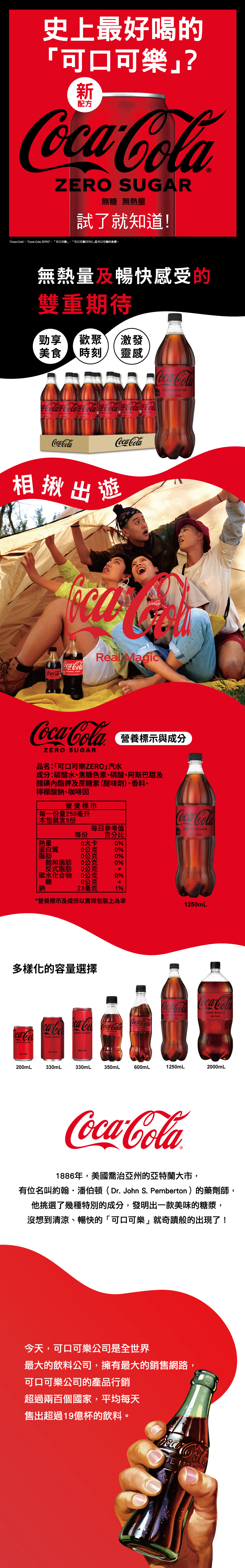 【可口可樂】ZERO1250mlx12入 商品重(容)量/規格:1250mlx12入/箱 內容物名稱(成分):碳酸水、焦糖色素、磷酸、阿斯巴甜及醋磺內酯鉀及蔗糖素(甜味劑)、香料、檸檬酸鈉、咖啡因。苯酮尿症患者(Phenylketonurics)不宜飲用。 食品添加物名稱:無 原產地(國):台灣 保存期限:9個月 食品業者登錄字號:F-127237675-00000-2 投保產品責任險字號:0500字第25APO0Q00113號