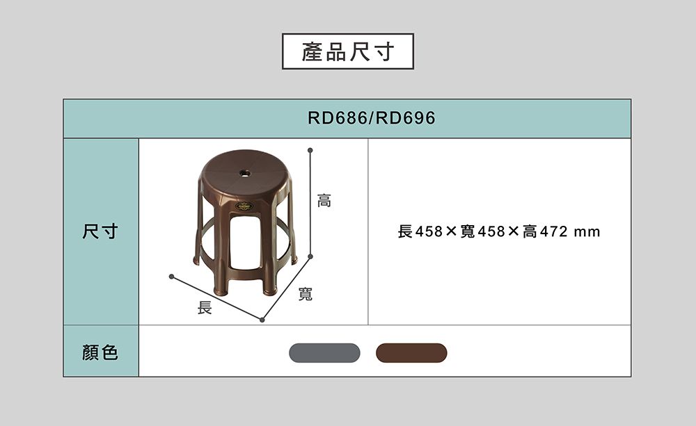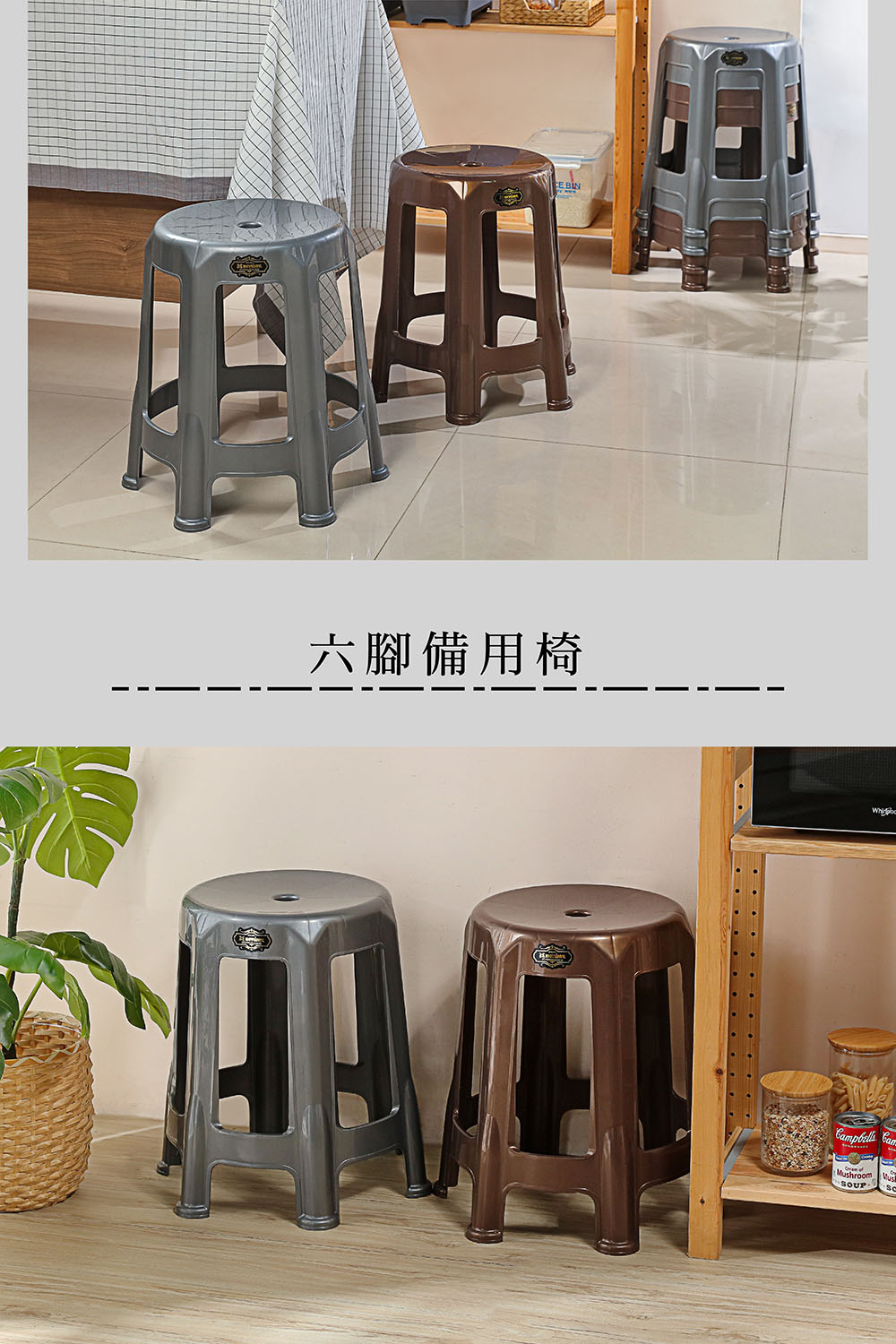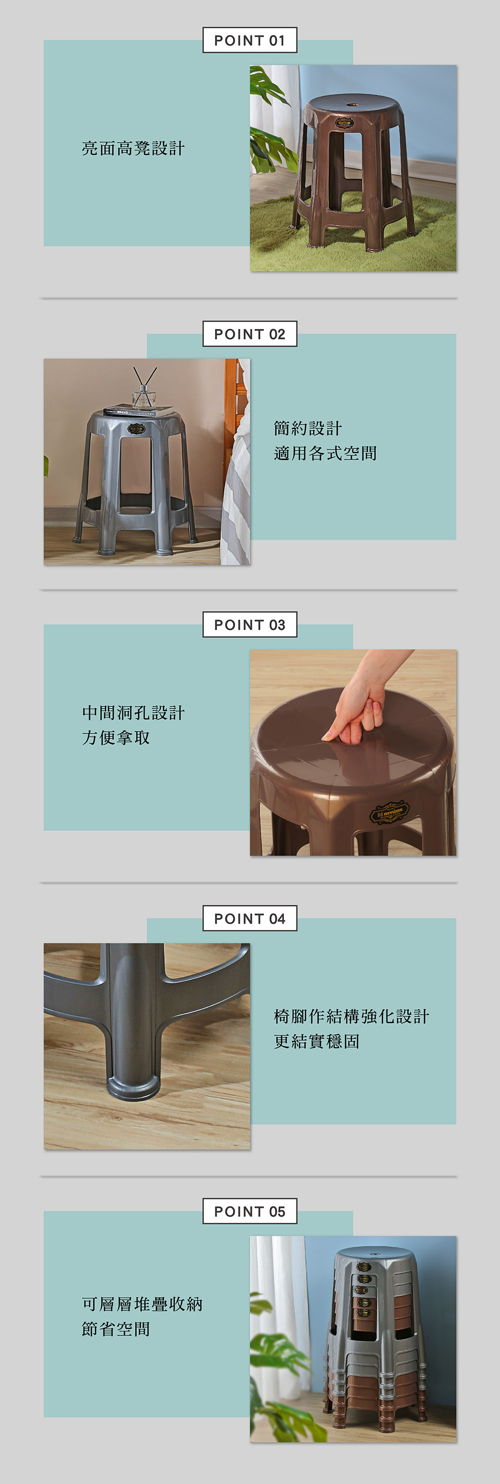 亮面圓型高凳設計,中間洞孔設計,方便拿取;椅腳作結構強化設計,更結實穩固,亦可堆疊收納,節省空間。