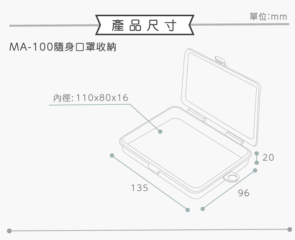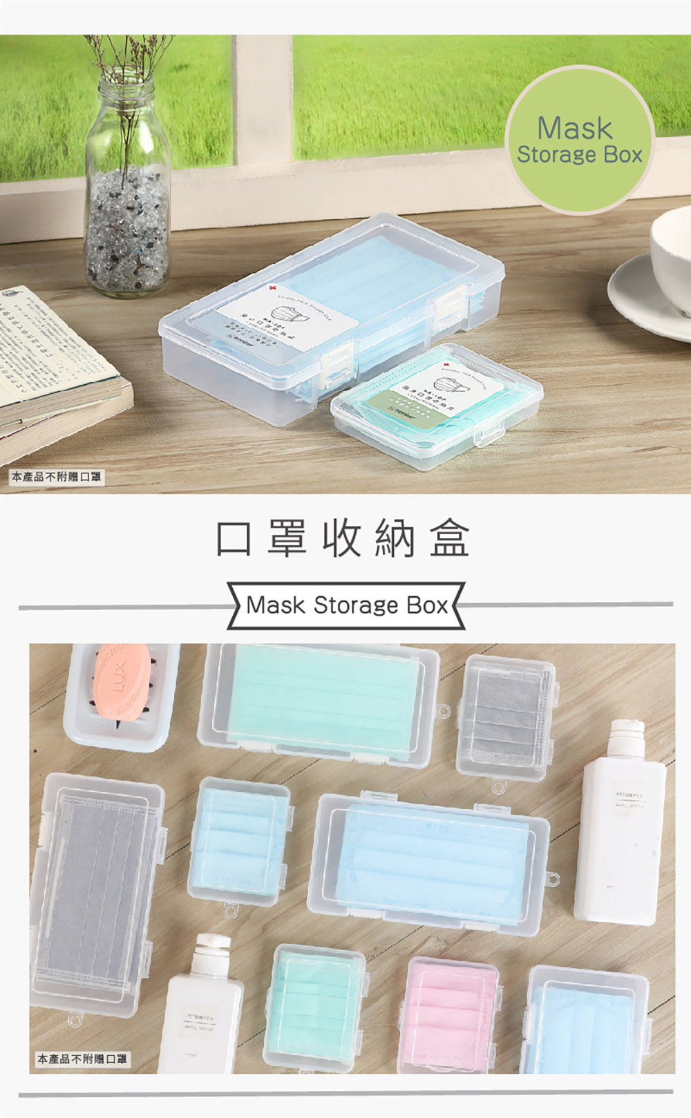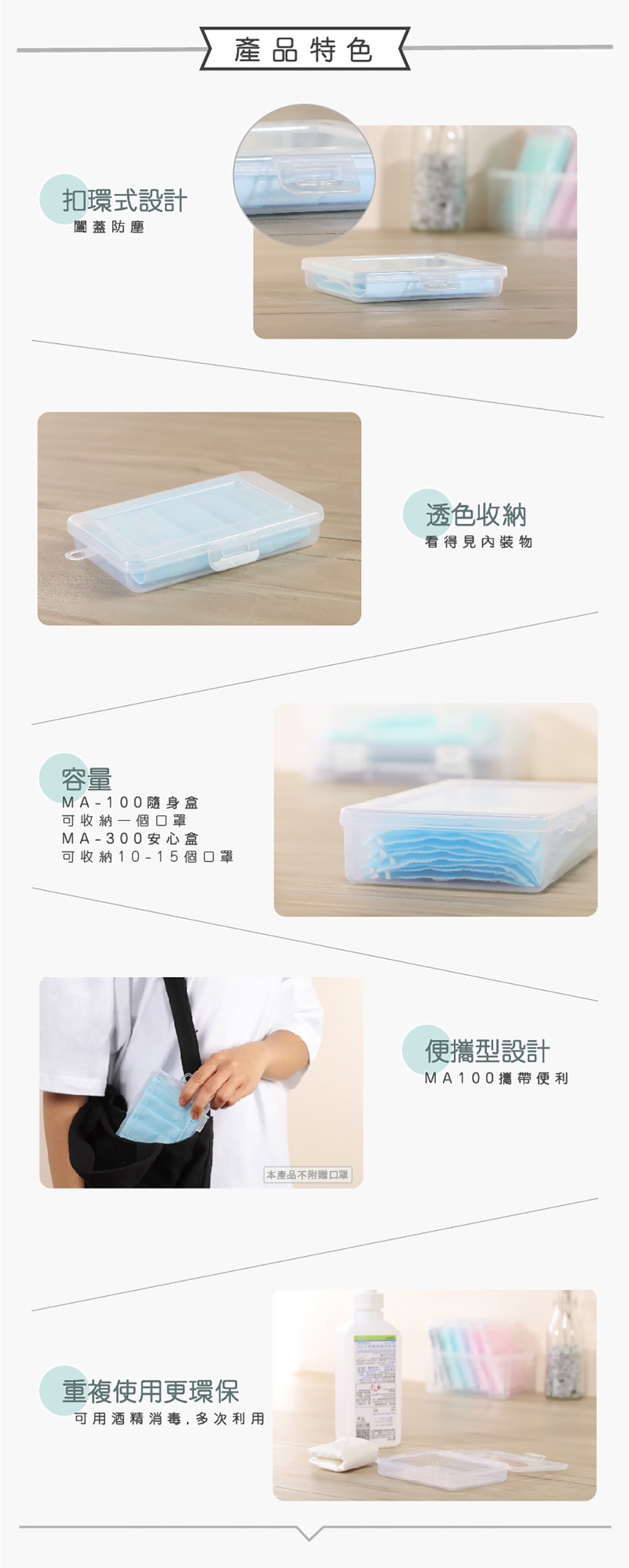 扣環式設計,闔蓋防塵;透色收納,看得見內裝物;隨身口罩盒(MA100)可收納一個口罩,隨身攜帶更便利;安心口罩收納盒(MA300)可收納10-15個口罩;可用酒精消毒,重複使用更環保,完整收納更安心。