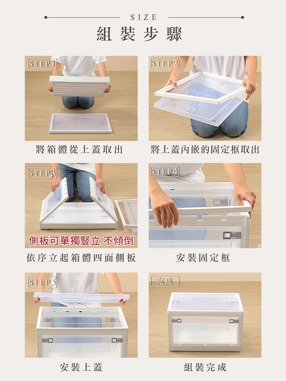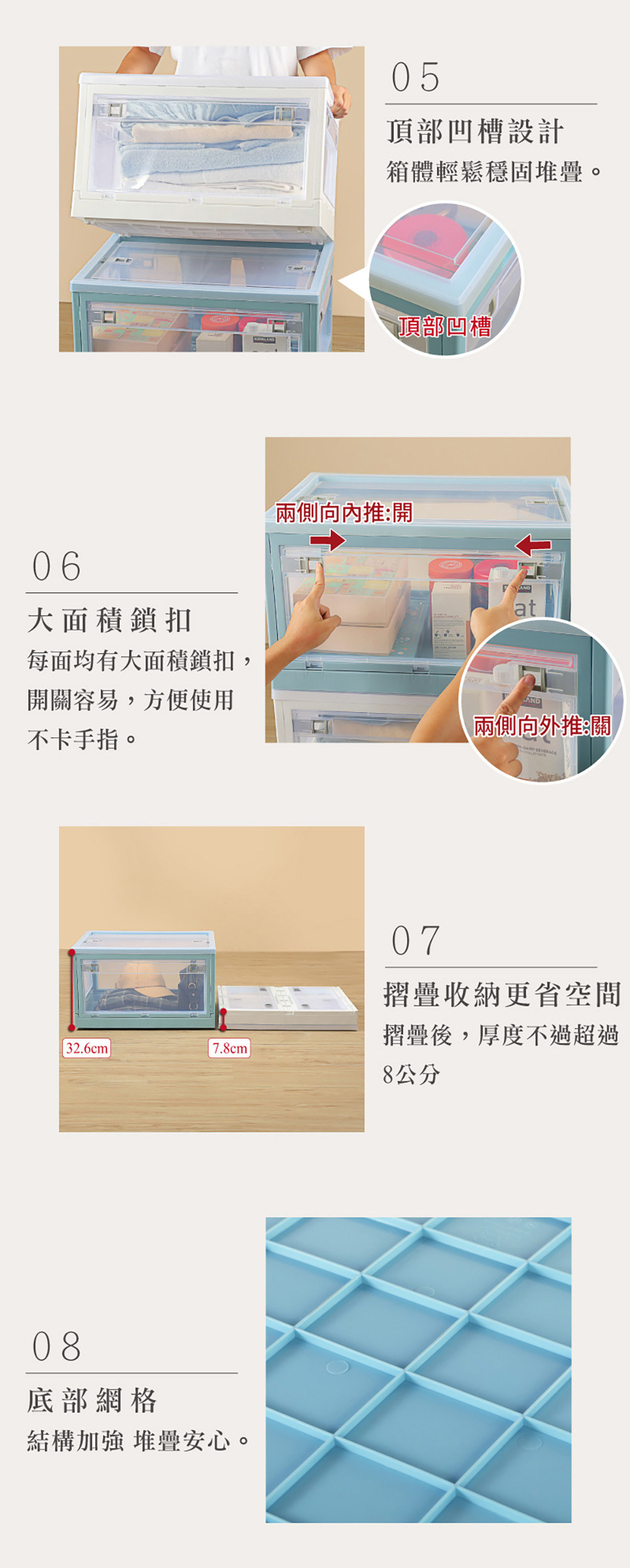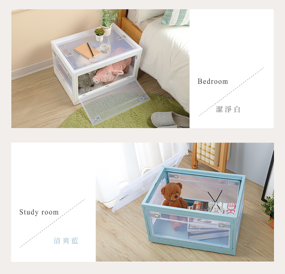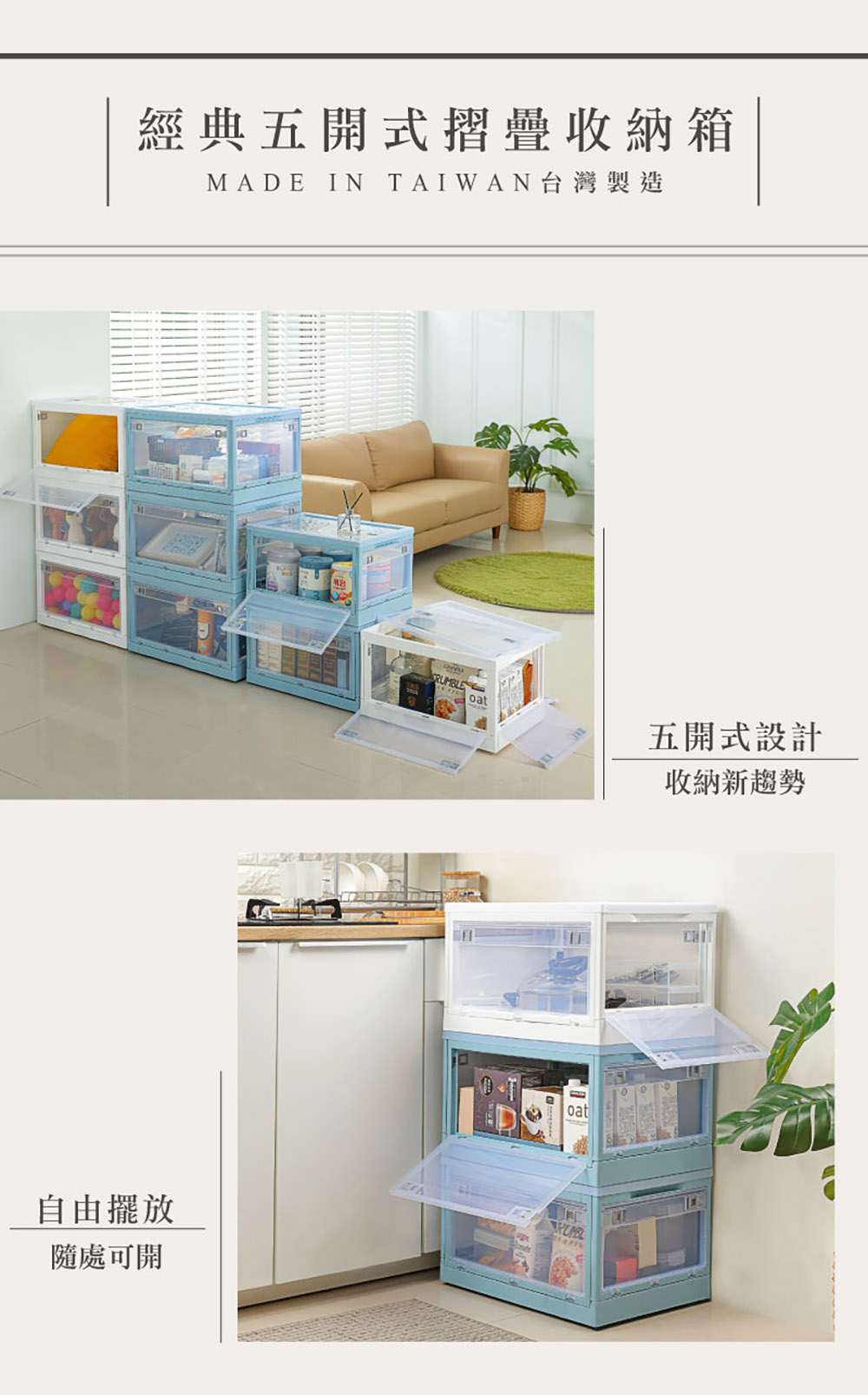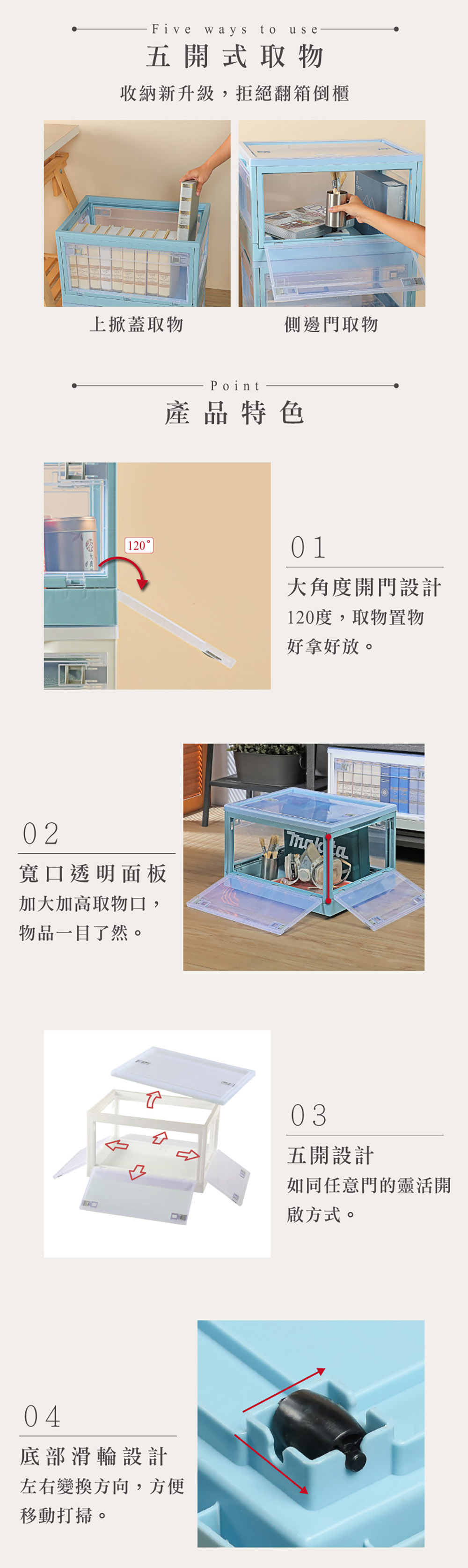 五開式(四面開門、上開蓋),取物置物自由方便開啟,底部雙向滑輪可拆變換方向(直向、橫向)方便移動打掃,不使用時輕鬆摺疊收納,厚度僅7.8公分(摺疊尺寸≒367*517*厚78mm)上蓋隱藏式鎖扣及側邊內嵌把手,收納箱併排時,可整齊靠攏無隙縫,四面門板加大加高、120度開門大角度設計,取物不卡卡(⾧邊開口440*195、短邊開口325*180mm),免工具組裝,四面側板均可單獨豎立、不傾倒,輕鬆好組裝,每㇐門板具二片大面積鎖扣設計,容易開關,方便不卡手指,上蓋全框式凹槽,輕鬆箱體穩固堆疊,,底部格紋結構穩固,產品DM附組裝說明,另有QRcode產品介紹及組裝示範。