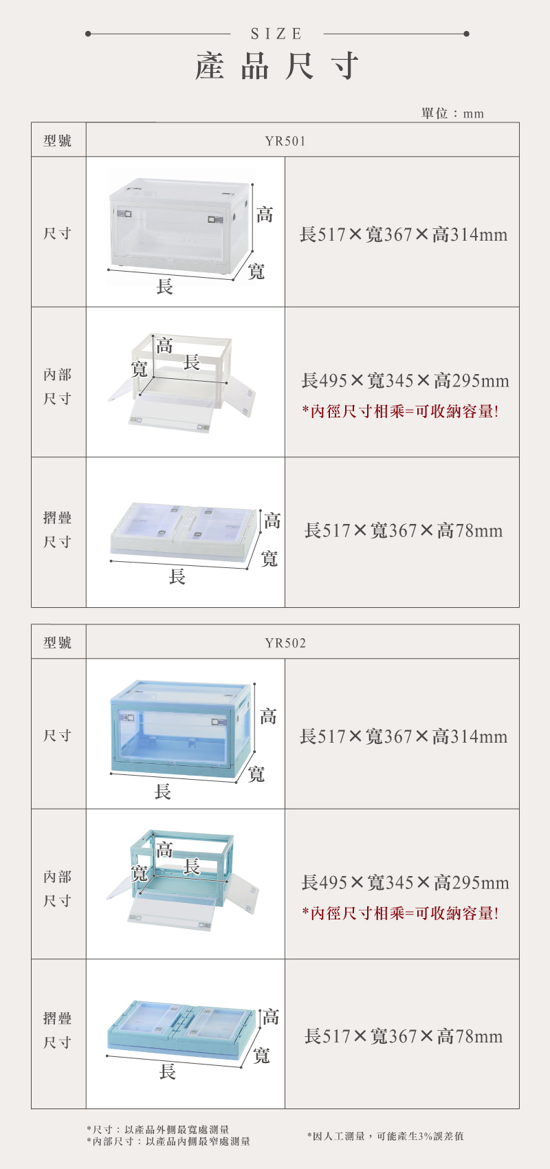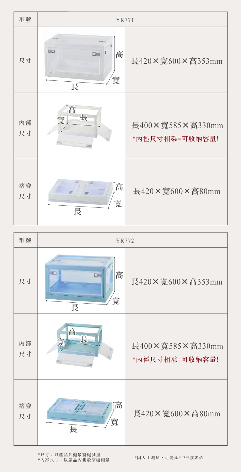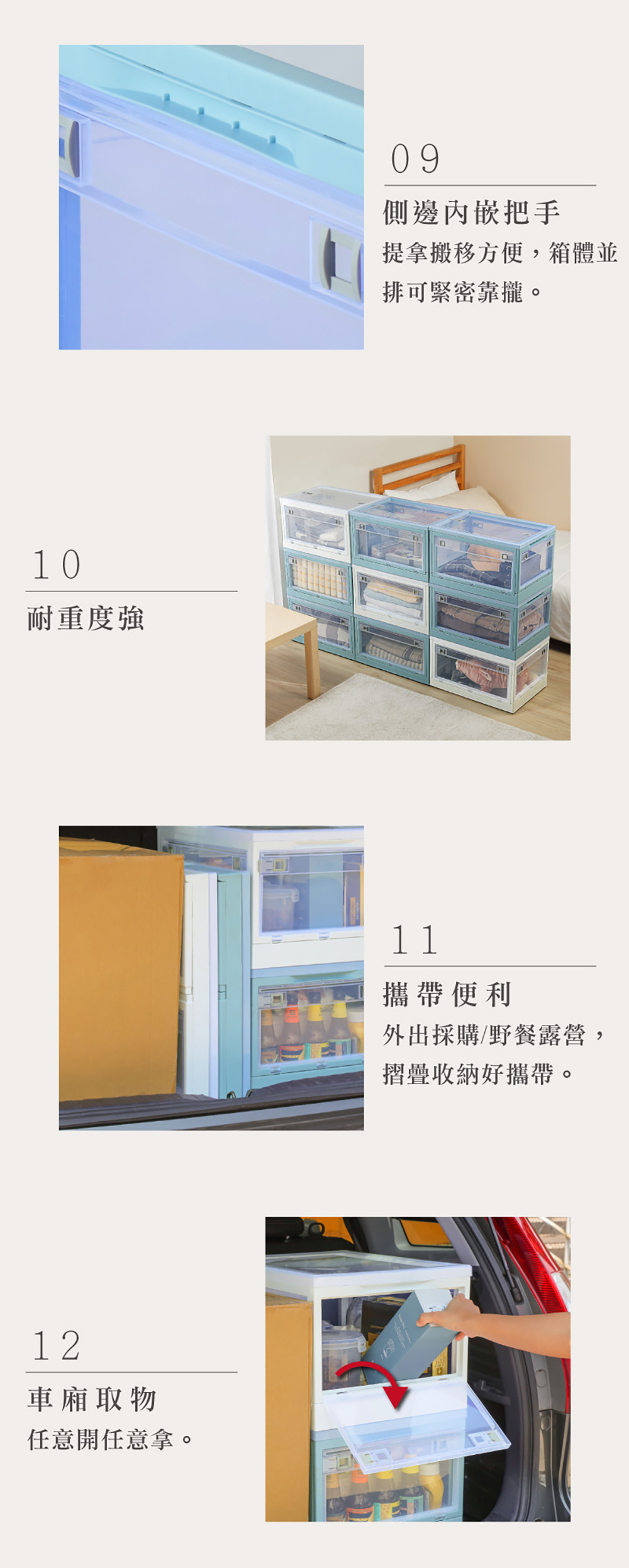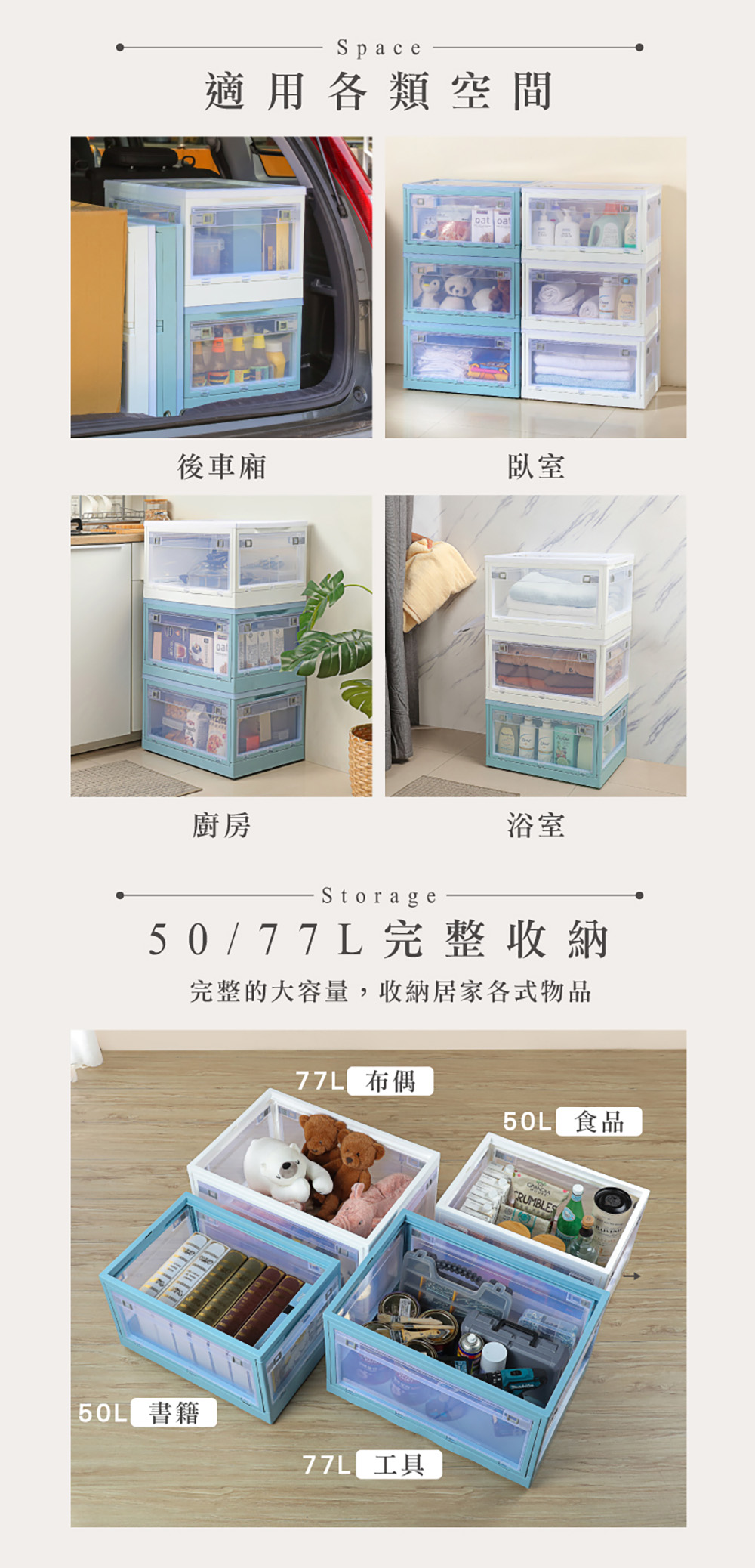 五開式(四面開門、上開蓋),取物置物自由方便開啟,底部雙向滑輪可拆變換方向(直向、橫向)方便移動打掃,不使用時輕鬆摺疊收納,厚度僅7.8公分(摺疊尺寸≒367*517*厚78mm)上蓋隱藏式鎖扣及側邊內嵌把手,收納箱併排時,可整齊靠攏無隙縫,四面門板加大加高、120度開門大角度設計,取物不卡卡(⾧邊開口440*195、短邊開口325*180mm),免工具組裝,四面側板均可單獨豎立、不傾倒,輕鬆好組裝,每㇐門板具二片大面積鎖扣設計,容易開關,方便不卡手指,上蓋全框式凹槽,輕鬆箱體穩固堆疊,,底部格紋結構穩固,產品DM附組裝說明,另有QRcode產品介紹及組裝示範。