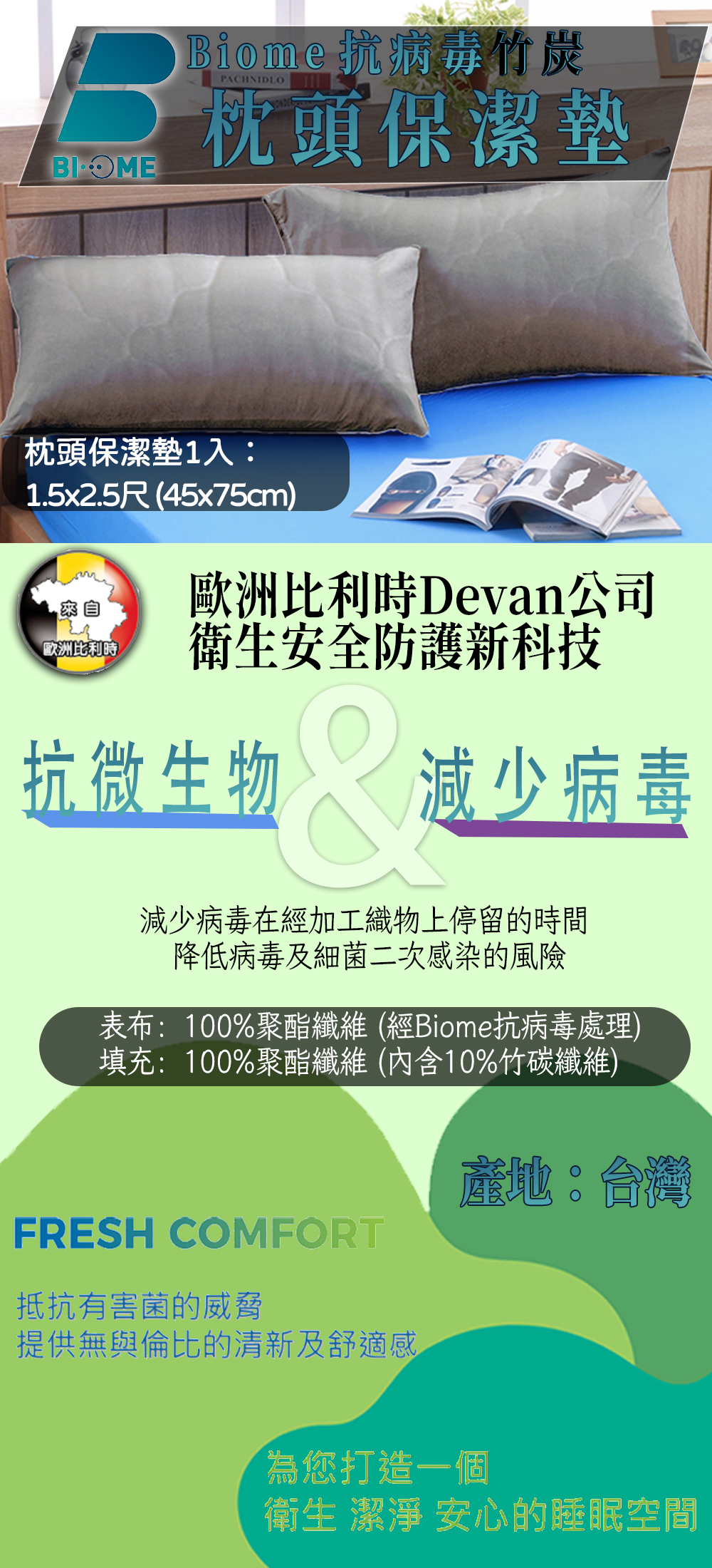 .台灣製造,品質保證 .添加竹炭纖維提升抑菌效果 .表布經Biome抗病毒處理,抵抗害菌威脅 .針對新冠肺炎 COVID 19 的病毒 SARS-COV2,證實可減少病毒活性