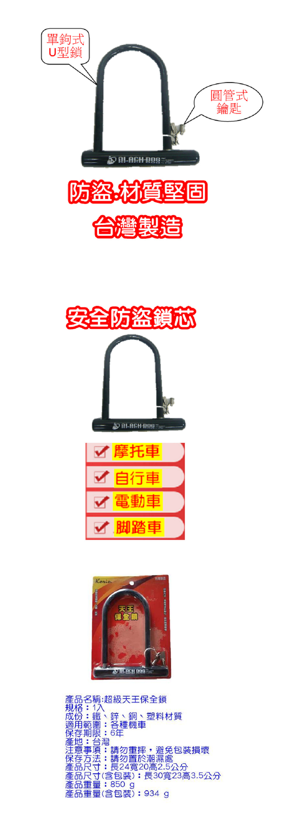 圓管式鑰匙,單鉤式U型鎖, 防盜、材質堅固 機車鎖勾加長,適用腳踏車,100cc以下機車,市售電動車 鋼管貼膠表皮,不傷鋁圈碟盤 台灣製造, 堅固耐用,品質保證