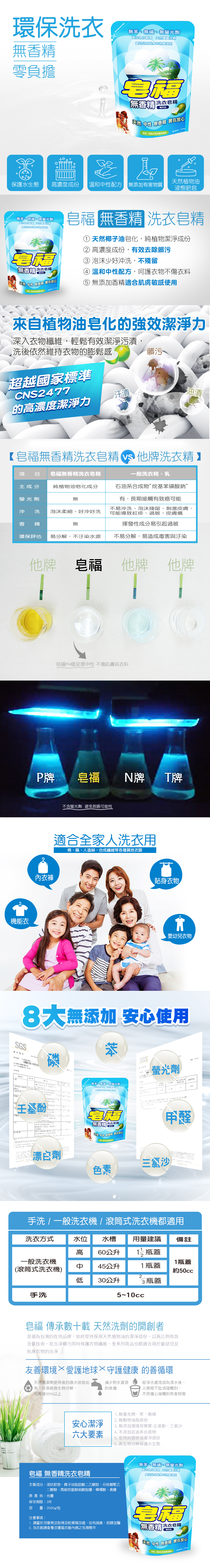 | 產品特色 | 1.天然植物油皂化、不含有害石化洗劑 成分 2.無色素、無香精、無螢光劑、無苯、無磷 3.泡沫少好沖洗 ,省水又省力 4.中性配方,呵護衣物不傷衣料,衣物觸感更柔軟舒適 |