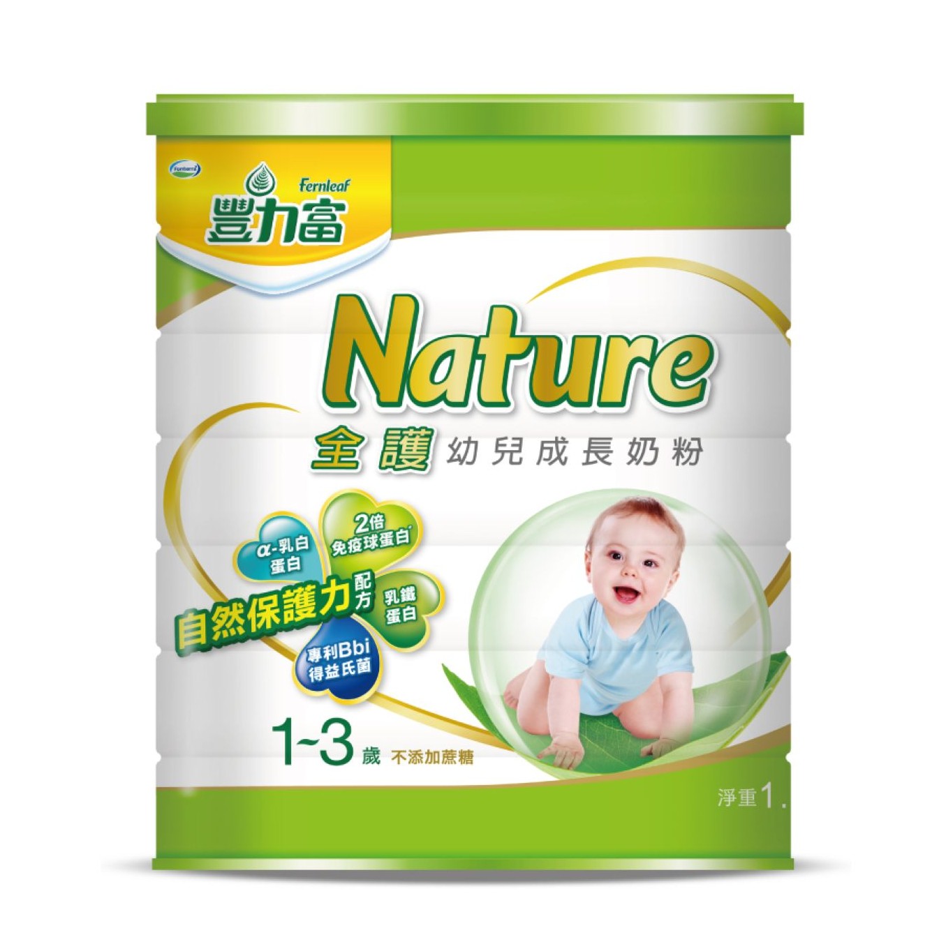 商品品名:【豐力富】Nature幼兒成長奶粉1-3歲 商品重(容)量/規格:1.5kgx6罐/箱 主要成份:全脂奶粉、麥芽糊精、乳清粉、濃縮乳清蛋白(含免疫球蛋白及乳鐵蛋白)、脫脂奶粉、牛奶香料、維生素(維生素C、维生素E、菸鹼醯胺、维生素A、維生素D3、維生素B6、维生素B1、葉酸)、大豆卵磷脂、植物性DHA藻油、礦物質(焦磷酸鐵、硫酸鋅)、Bbi得益氏菌(Bifidobacterium lactis DR-10TM)、乳鐵蛋白 產地:台灣 保存期限:24個月 食品添加物:如成分標示 廠商名稱:香港商遠東恆天然乳品有限公司台灣分公司 廠商電話號碼:0800-021216 廠商地址:台北市敦化南路一段2號11樓 投保保險公司:安聯人壽 投保產品責任險字號:SGL0003760251 食品業者登錄字號:A-112430309-00000-0