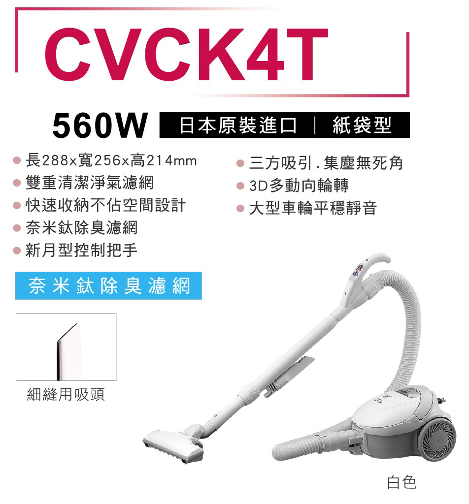 商品品名:【HITACHI 日立】日本原裝紙袋型吸塵器(CVCK4T)-194-CVCK4T