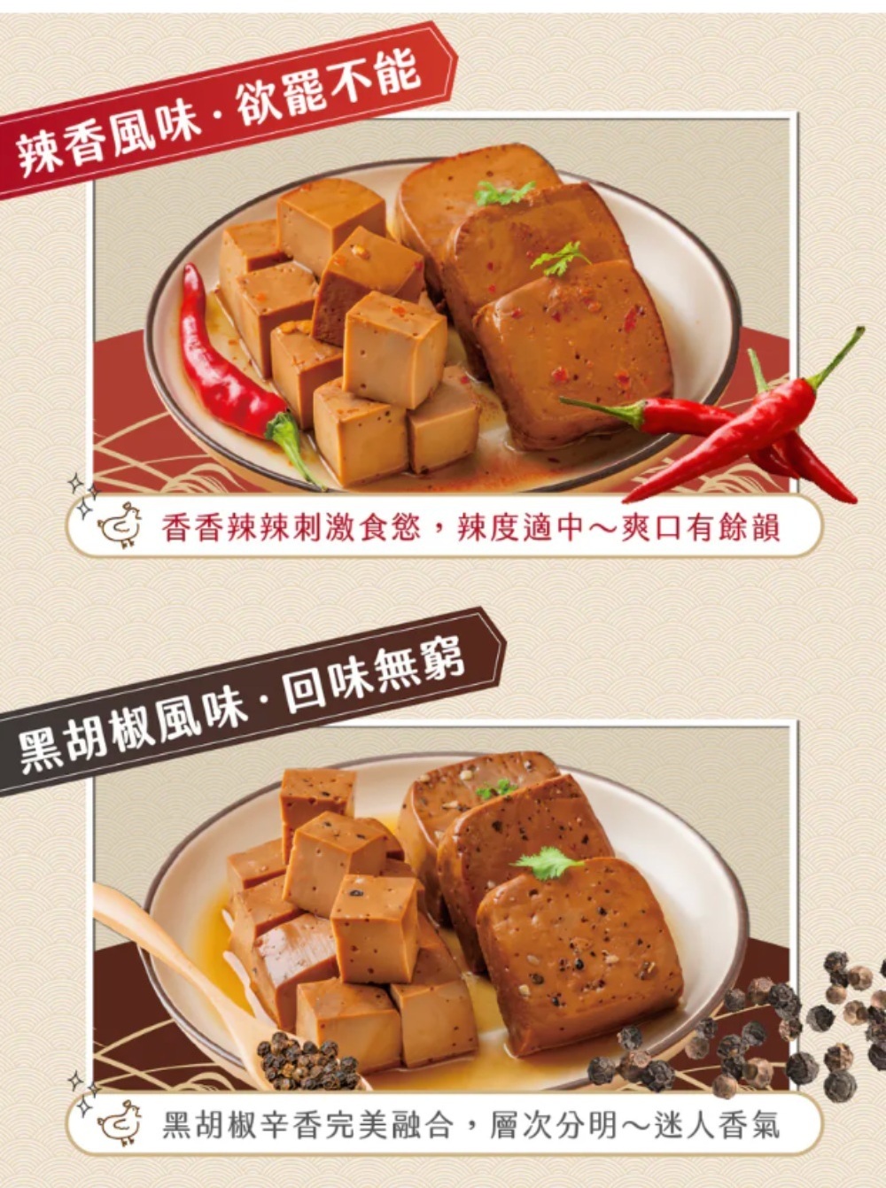本產品醬香、黑胡椒為蛋奶素,香辣口味為五辛素