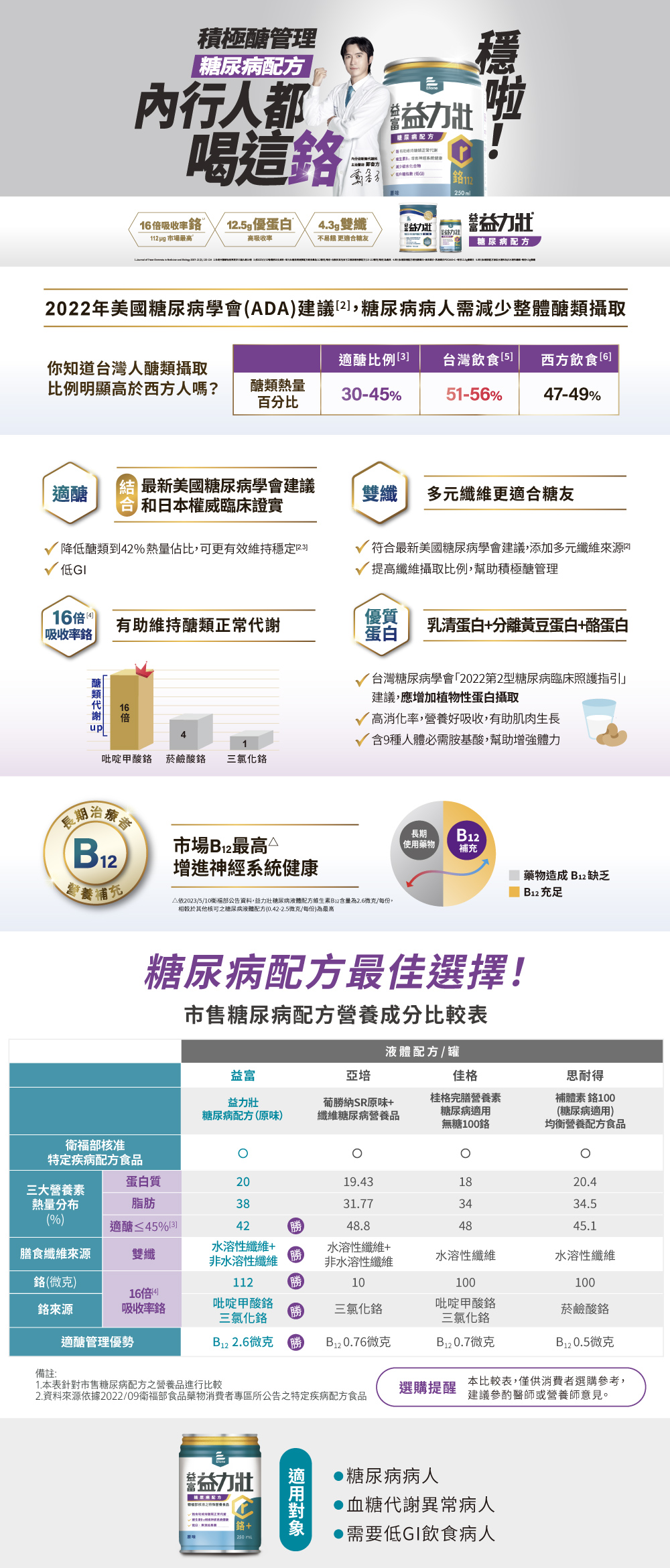 ●16倍吸收率鉻,有助維持醣類正常代謝 ●市場最高維生素B12,幫助長期治療者營養補充 ●4.3克雙纖,不易餓,更適合糖友