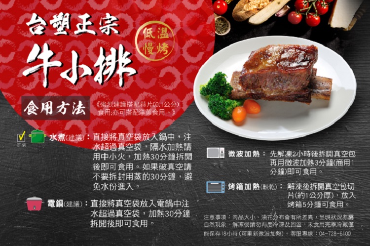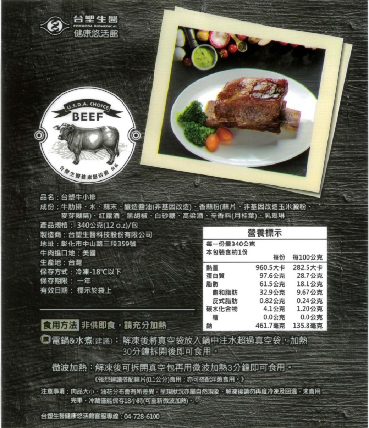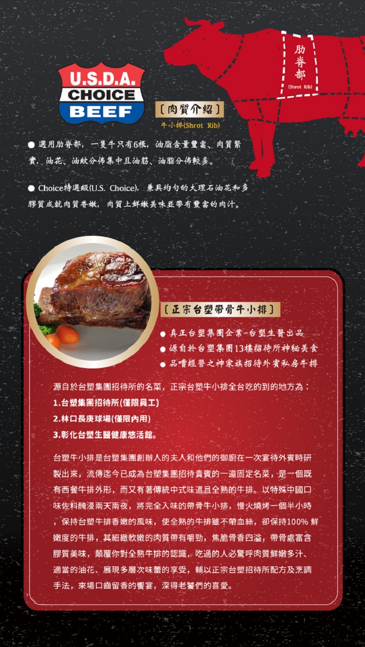 真正台塑集團企業-台塑生醫出品,源自台塑集團招待所神秘美食,美國特選3A牛小排,17種秘製調味烘烤,肉質細緻軟嫩。