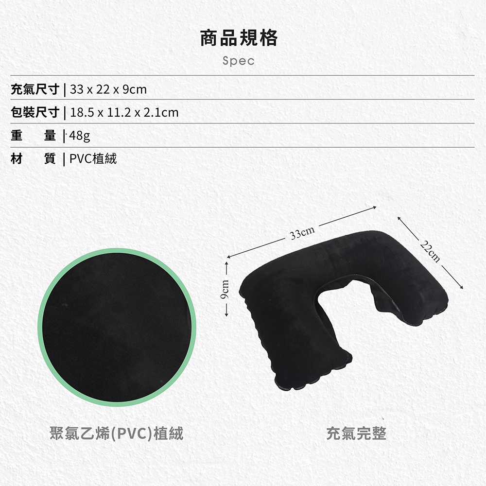 充氣尺吋:33x22x9cm 收納尺吋:18.5x11.2x2.1cm 重量: 48g 材質:PVC植絨 產地:中國◎ 製造日期與有效期限,商品成分皆標示於包裝盒上 ◎ 本產品網頁因拍攝關係,圖檔略有差異,實際以廠商出貨為主 ◎ 本產品文案若有變動敬請參照實際商品為準