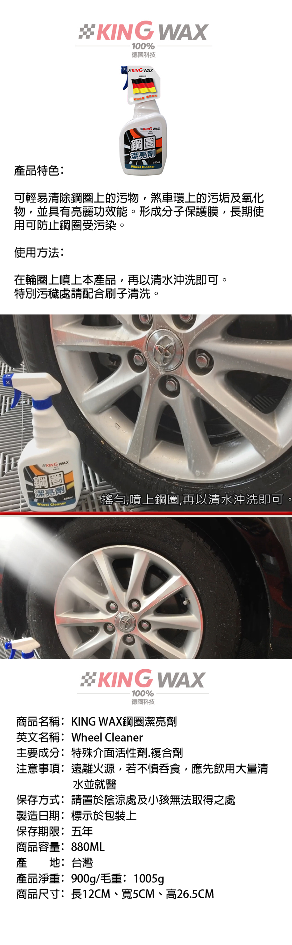 可輕易清除鋼圈上的污物,煞車環上的污垢及氧化物,並具有亮麗功效能。形成分子保護膜,長期使用可防止鋼圈受污染