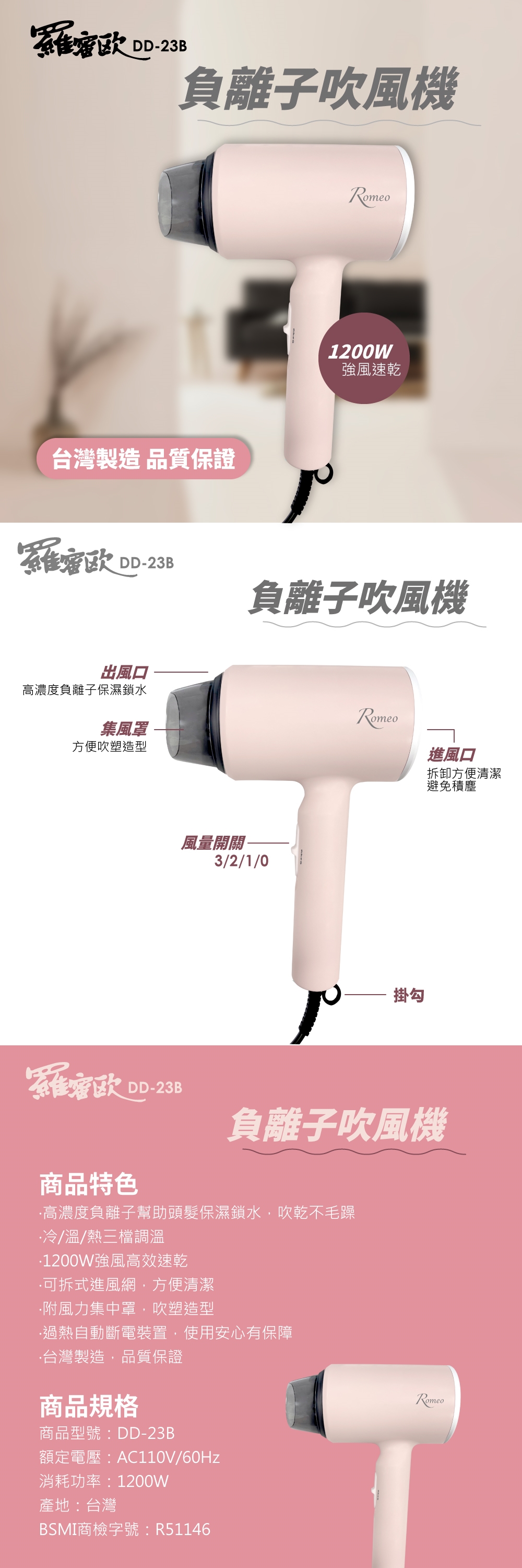 ‧三檔調溫,1200W強風高效速乾