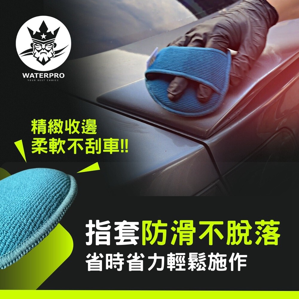 Waterpro手持式上蠟布,純臺灣製造,精緻纖維上下蠟更均勻,指套固定設計省時省力,不易脫落,精緻纖維彈力極佳,拋光壓邊效果極好,方便清洗可重複使用。