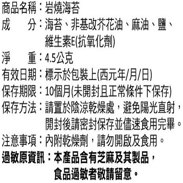規格:4.5g/包成分:海苔、非基改芥花油、麻油、鹽、維生素E(抗氧化劑)