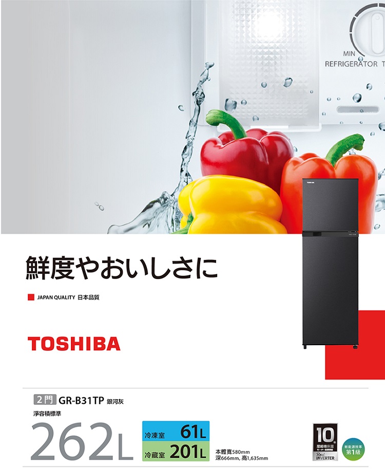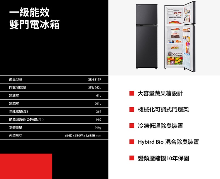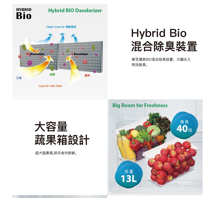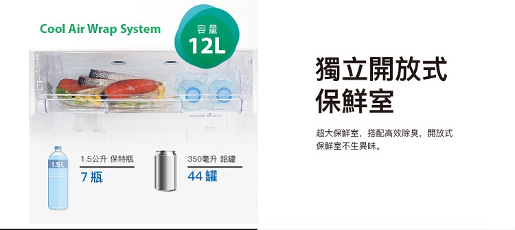 ●冷凍低溫除臭裝置 ●獨立開放保鮮室 ●小家庭、租屋族的首選冰箱