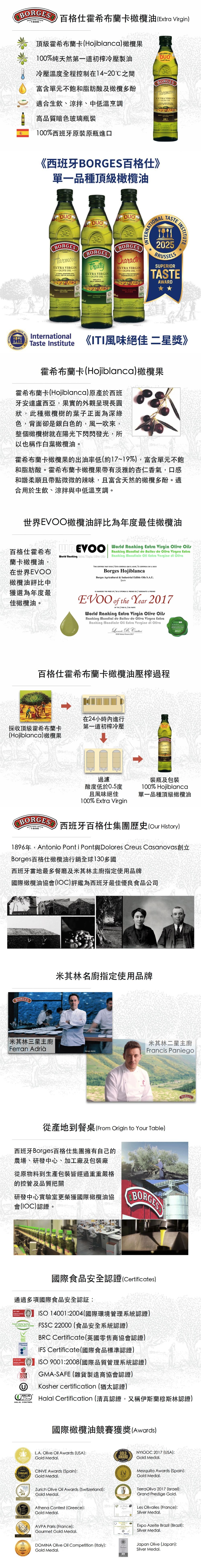 | 產品特色 | 1.富含單元不飽和脂肪酸及橄欖多酚 2.頂級霍希布蘭卡橄欖果 3.100%純天然第一道初榨冷壓橄欖油 4.口感和諧柔順 5.100%西班牙原裝原瓶進口 |