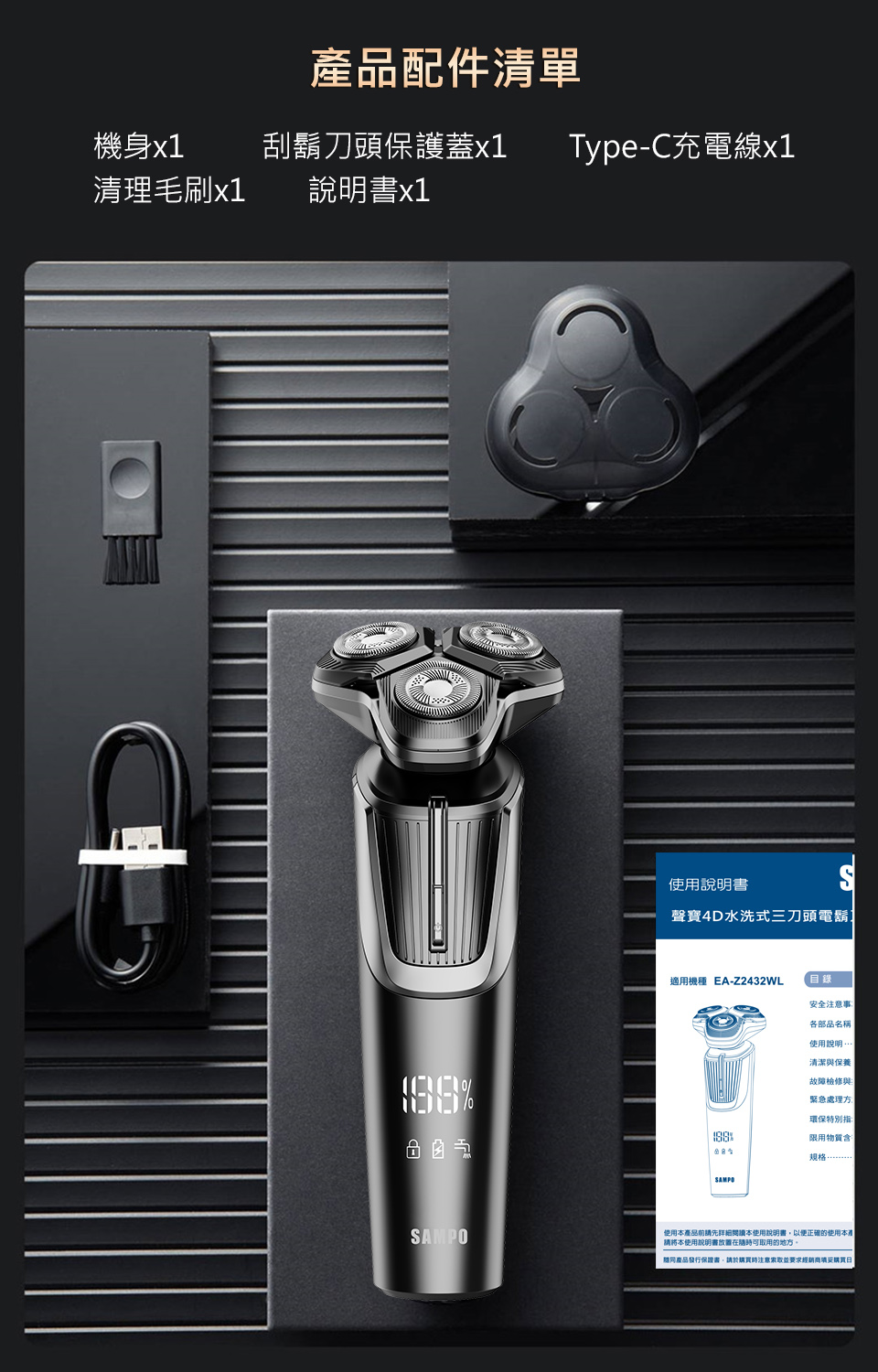 1.型號:聲寶4D水洗式三刀頭電鬍刀 EA-Z2432WL