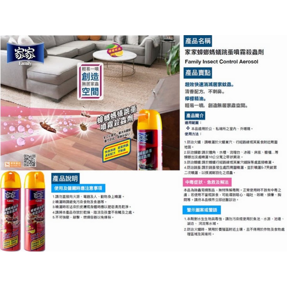 規格550ml 內容、成分:依普寧(lmiprothrin) 0.10%w/w 賽滅寧(Cypermethrin)0.30%w/w 保存期限:3年 產地:馬來西亞 保險字號:富邦產險0527字第21AM0000107號 環境用藥許可證號: 環署衛輸字第0846號 環境用藥販賣業許可執照字號: 八八環藥販賣字第05-003號 公司名稱:家家產品股份有限公司 公司地址:苗栗縣銅鑼鄉民享路5號 電話:037984912◎ 製造日期與有效期限,商品成分皆標示於包裝盒上