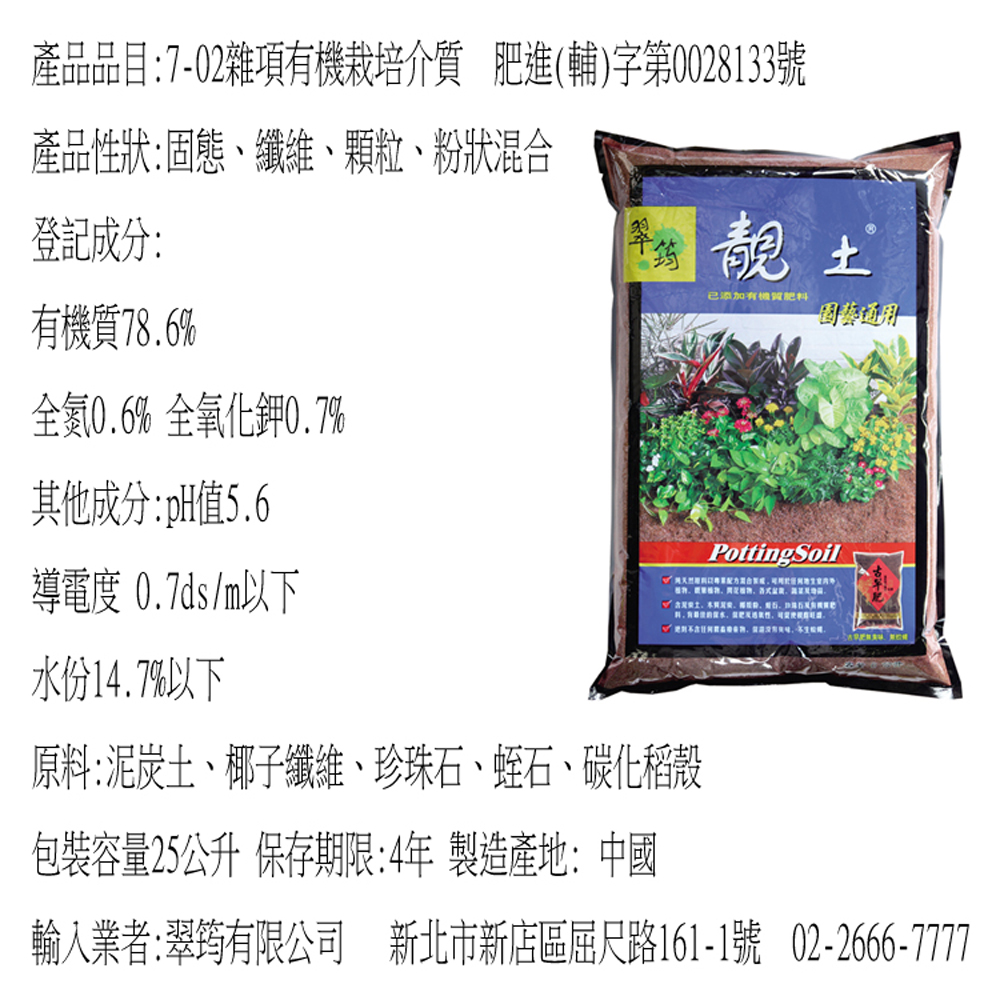 其他成分: pH值5.6 導電度 0.7ds/m 水份14.7%