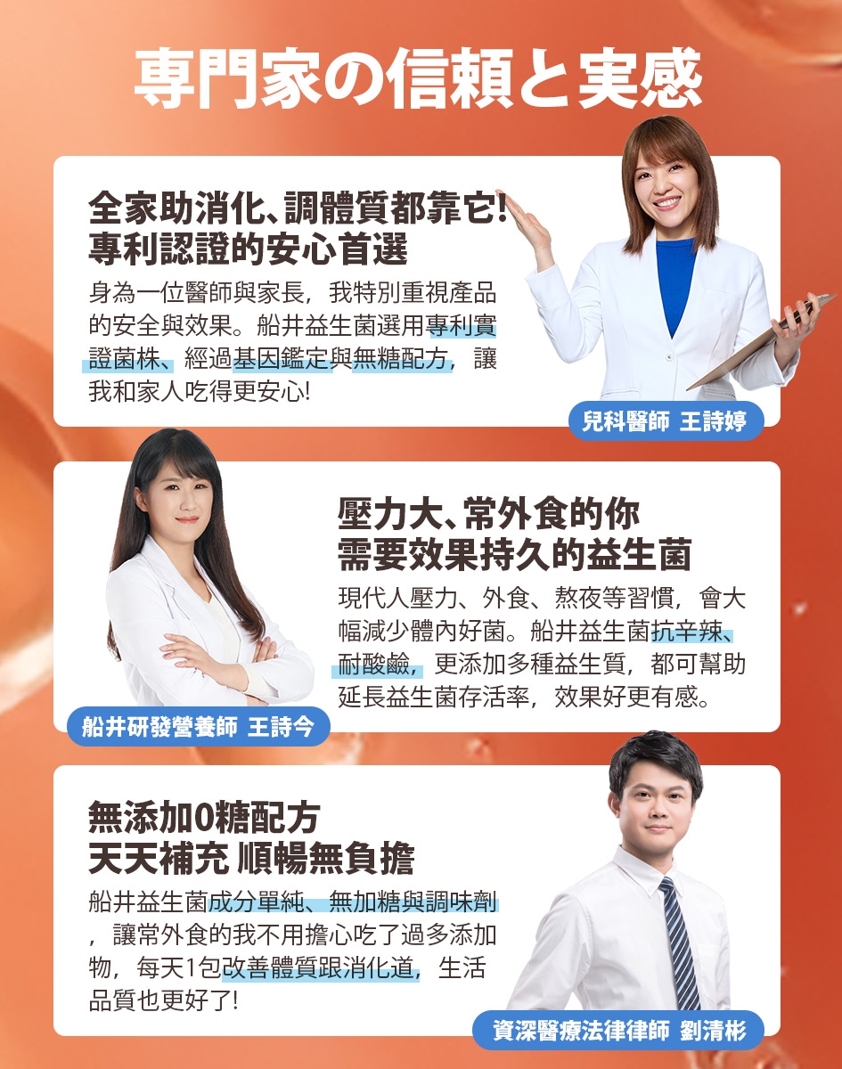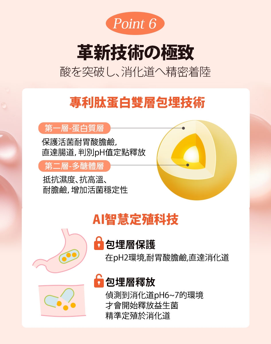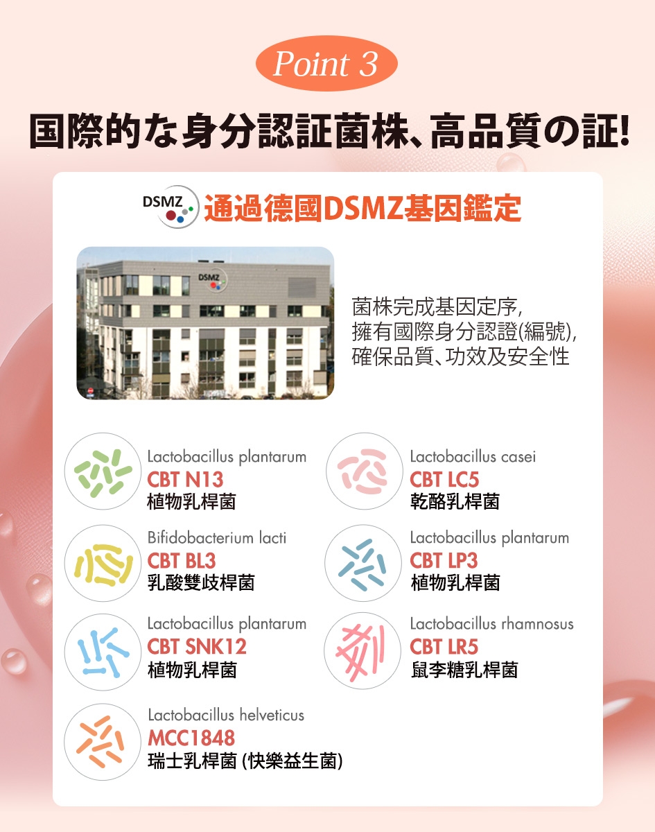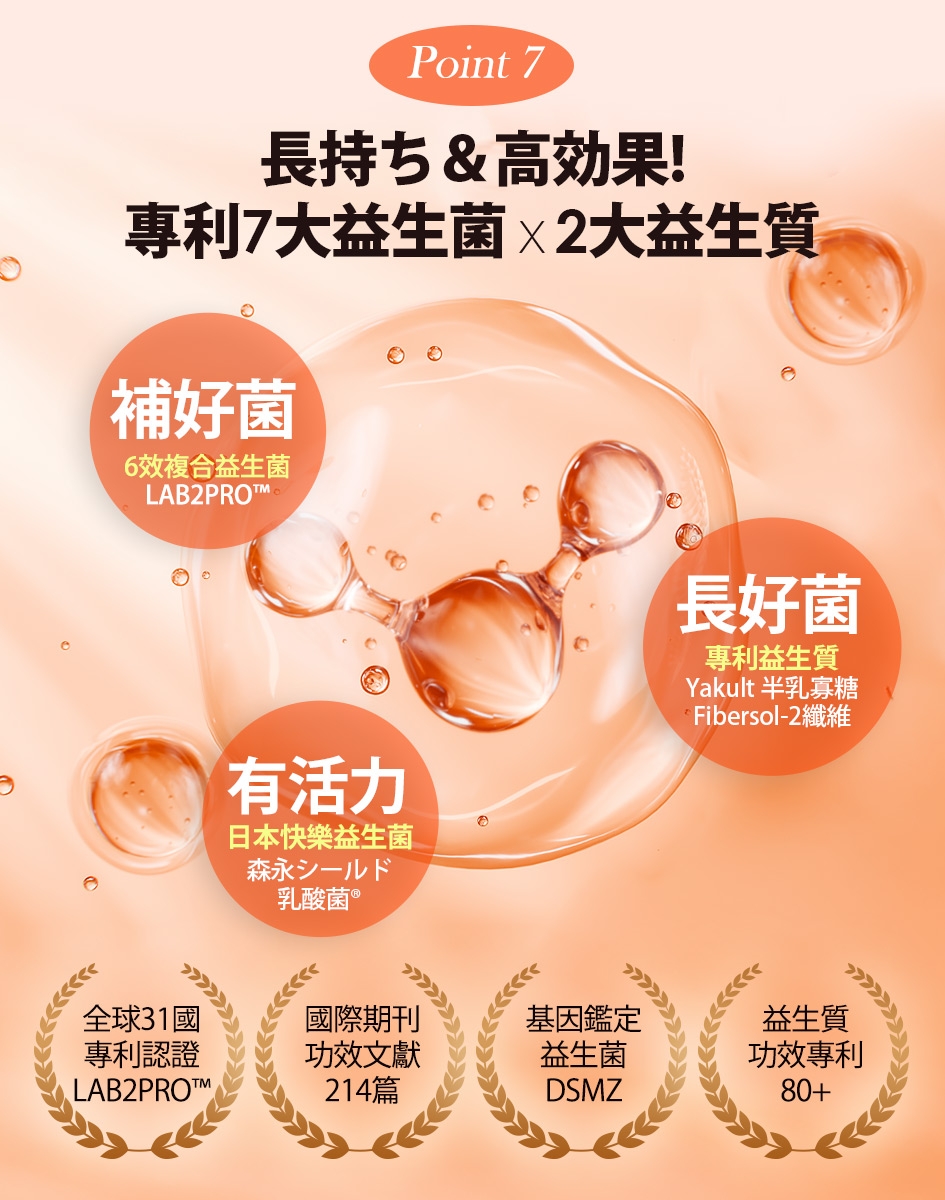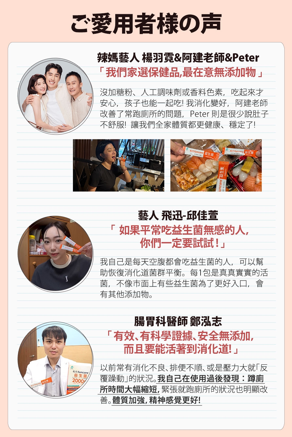 ●日本原裝進口,市售最高1包2000億活菌益生菌 ●100倍好菌存活率 ●專利肽蛋白雙層包埋技術,7小時耐胃酸膽鹼 ●專利菌株不怕辛辣、蔥薑蒜,享受美食好菌活力不打折! ●消化道雙向調節(改善常跑廁所、或排便不順) ●幫助消化、排便順暢、調整體質、增強保護力 ●0蔗糖、無香料、無色素 ●通過SGS 808項檢驗合格,無塑化劑、防腐劑、重金屬、農藥殘留 ●全家人可食 (4個月以上兒童、成人、銀髮族、孕婦)