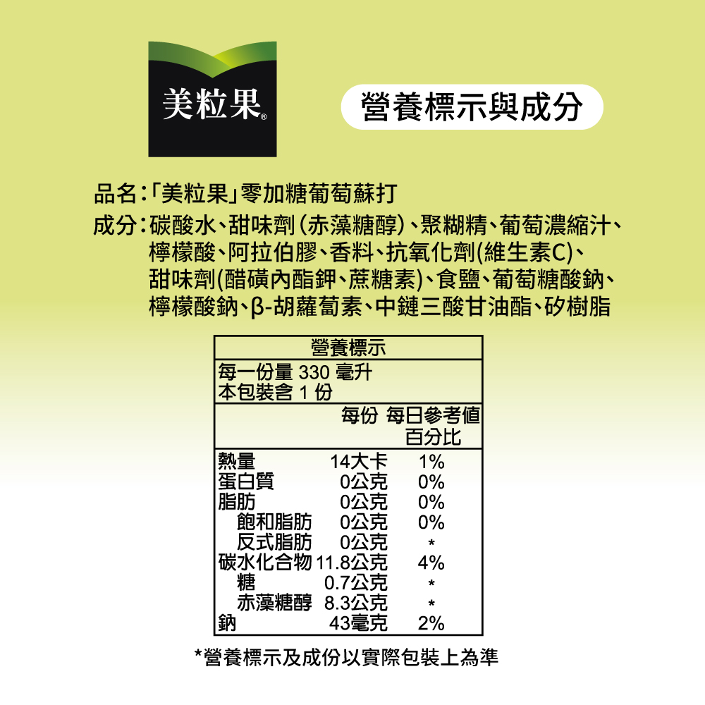 內容物名稱(成分):碳酸水、甜味劑(赤藻糖醇)、聚糊精、葡萄濃縮汁、香料、檸檬酸、阿拉伯膠、甜味劑(醋磺內酯鉀、蔗糖素)、抗氧化劑(維生素C)、食鹽、葡萄糖酸鈉、β-胡蘿蔔素、檸檬酸鈉、中鏈三酸甘油酯、矽樹脂。