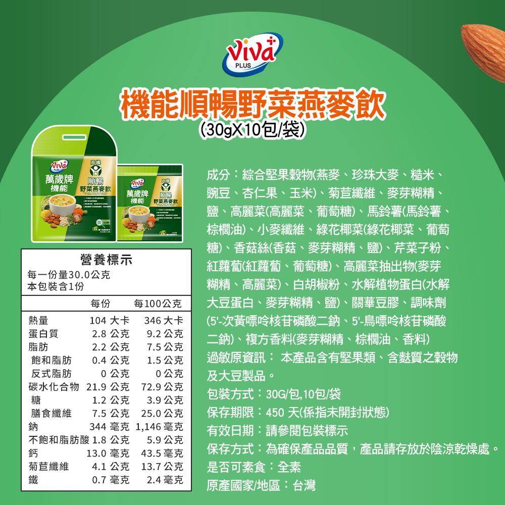 萬歲牌機能順暢野菜燕麥飲,精選多種野菜與綜合堅果穀物,含豐富的膳食纖維,添加菊苣纖維,每天一杯補充高膳食纖維含量,可促進腸道蠕動使排便順暢,並可增加飽足感、幫助維持消化道機能,天天喝調整體質健康維持。