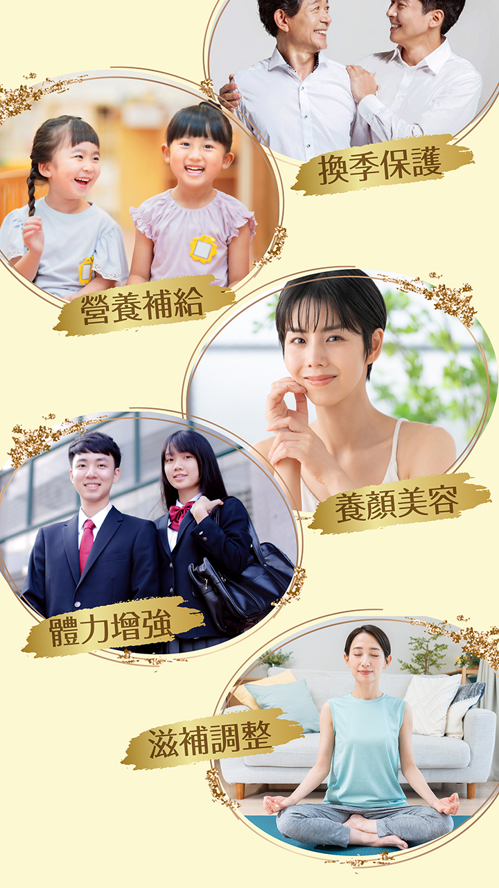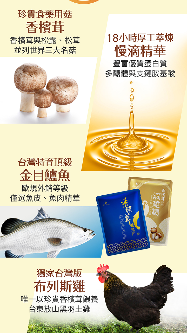 金目鱸、料理米酒、香檳茸子實體(Agaricus blazei Murill純淨牧草全環控固態培養)、黃耆、薑;全雞、鮮採香檳茸子實體(Agaricus blazei Murill 純淨牧草全環控固態培養)