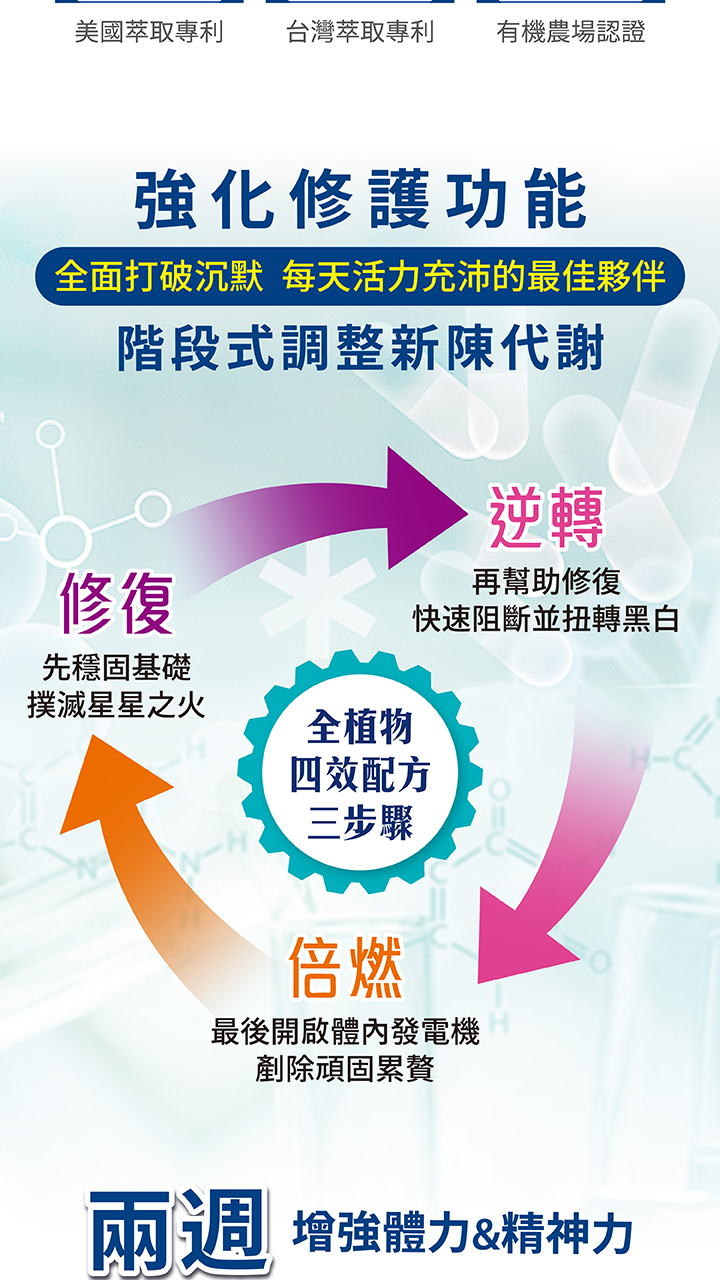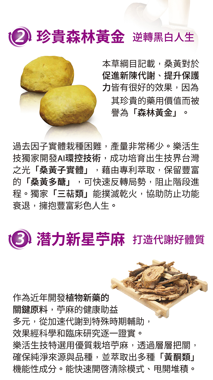 桑黃子實體萃取物(Phellinus linteus 固態培養)、香檳茸萃取物(Agaricus blazei Murill純淨牧草全環控固態培養)、苧麻萃取物、薑黃萃取物、植物膠囊(羥丙基甲基纖維素、純水、鹿角菜膠、食用焦糖色素、氯化鉀、二氧化鈦)