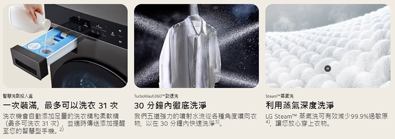 一\體成型,極簡流線外型設計 洗乾全 AI,AI DD 智慧洗滌+AI Dry 智慧乾衣 HeatPump 雙變頻熱泵除濕式乾衣 全觸控中央控制液晶面板,人體工學高度適中 Smart Pairing 智慧行程配對,預熱乾衣減少等待時間 智慧洗劑投入,自動精準添加剛好的洗劑量