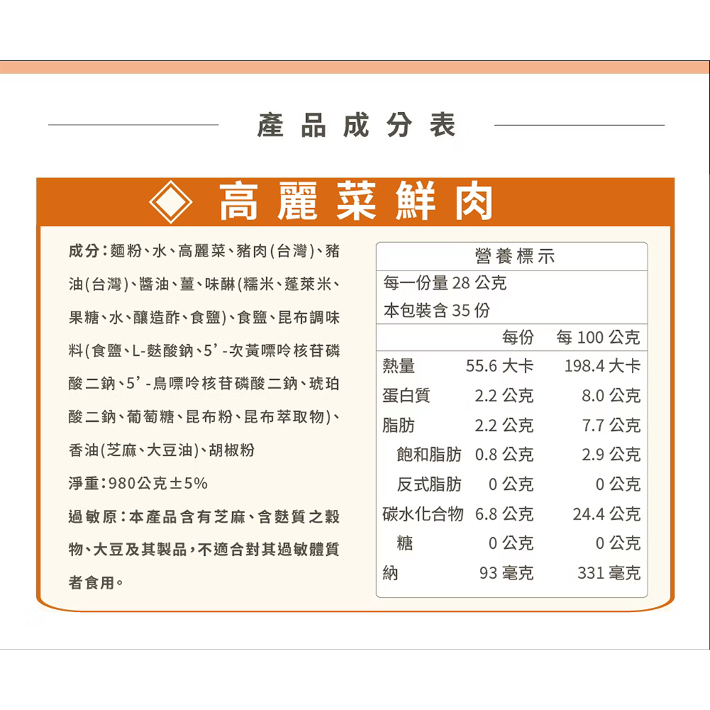 1.商品組合/規格:35粒/包 2.商品品名:高麗菜鮮肉水餃 3.商品重(容)量:約1000g/包 4.內容物成分(如含有豬、牛成分請加註國別):麵粉、水、高麗菜、豬肉(台灣)、豬油(台灣) 5.食品添加物名稱:醬油、薑、味醂、食鹽、昆布調味料、香油、胡椒粉 6.原產地(國):台灣 7.製造廠商或國內負責廠商名稱:琴名祿餐飲有限公司 8.製造廠商或國內負責廠商地址:台北市內湖區內湖路一段737巷51弄16號 9.製造廠商或國內負責廠商電話:02-27912622 10.食品業者登錄字號:A-194048870-00000-8 11.投保產品責任險字號:132312AKP000011 備註欄:本產品含有芝麻、含麩質之榖物、大豆及其製品,不適合對其過敏體質者食用。