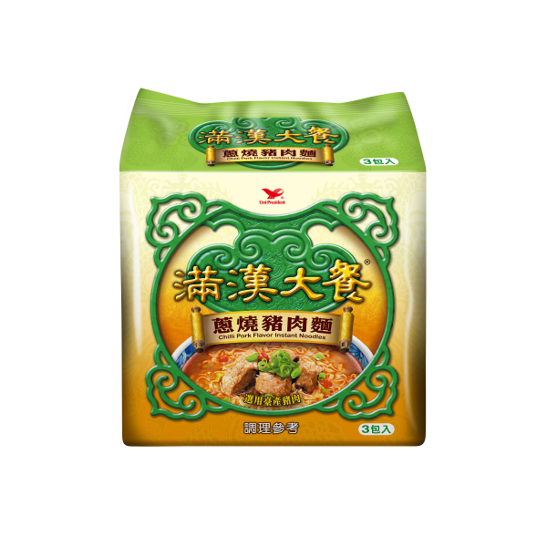 【滿漢大餐】袋麵-蔥燒豬肉麵(193gx3入)x4組 商品重(容)量/規格:(193gx3入)x4組/箱 內容物名稱(成分):麵:麵粉、精製棕櫚油(棕櫚油、抗氧化劑混合濃縮生育醇)、粘稠劑(醋酸澱粉、海藻酸鈉)、水、乳化油(甘油、精製大豆油、水、脂肪酸聚合甘油酯、大豆卵磷脂)、食鹽、小麥蛋白、品質改良用劑(碳酸鉀、多磷酸鈉、無水碳酸鈉)、蛋白粉、複方β-胡蘿蔔素(甘油、中鏈三酸甘油酯、水、脂肪酸聚合甘油酯、抗氧化劑維生素E、β-胡蘿蔔素)、抗氧化劑混合濃縮生育醇(含精製芥花油)。 調味粉包:味精、食鹽、豬肉風味粉〔麥芽糊精、蛋白質水解物(大豆、玉米、小麥)、食鹽、豬抽出物、精製芥花油、酵母抽出物、洋蔥抽出粉、香料、D-木糖〕、氯化鉀、酵母抽出粉(酵母抽出物、食鹽、葵花油)、洋蔥粉、脫水青蔥、焦糖色素、香料、小茴香粉、葡萄糖、蒜粉、麥芽糊精、脫水辣椒、胡椒粉、八角粉、花椒粉、5'-次黃嘌呤核苷磷酸二鈉、5'-鳥嘌呤核苷磷酸二鈉、磷酸鈣。 調味油包:精製棕櫚油(棕櫚油、抗氧化劑混合濃縮生育醇)、辣豆瓣醬(辣椒、大豆、食鹽、水、米)、豬脂(臺灣)、青蔥、醬油、蒜、沙茶醬(精製芥花油、魚乾、蒜、薑粉、椰子粉、蔥乾、芝麻、赤尾青、辣椒粉、食鹽、胡荽、肉桂、茴香、胡椒粉)、芝麻油、複方香料(香料、焦糖色素、味精、5'-次黃嘌呤核苷磷酸二鈉、5'-鳥嘌呤核苷磷酸二鈉)、香料。 料理包:水、豬肉(臺灣)、青蔥、精製豬油〔豬油(西班牙)、抗氧化劑混合濃縮生育醇〕、辣豆瓣醬(辣椒、大豆、食鹽、水、米)、醬油、豆瓣醬(水、大豆、食鹽、麵粉、八角粉)、料理米酒、樹薯澱粉、蒜、薑、蔗糖、花椒粉、八角粉、小茴香粉、油桂粉。(固形量25公克,內容量100公克) 食品添加物名稱:麵:麵粉、精製棕櫚油(棕櫚油、抗氧化劑混合濃縮生育醇)、粘稠劑(醋酸澱粉、海藻酸鈉)、水、乳化油(甘油、精製大豆油、水、脂肪酸聚合甘油酯、大豆卵磷脂)、食鹽、小麥蛋白、品質改良用劑(碳酸鉀、多磷酸鈉、無水碳酸鈉)、蛋白粉、複方β-胡蘿蔔素(甘油、中鏈三酸甘油酯、水、脂肪酸聚合甘油酯、抗氧化劑維生素E、β-胡蘿蔔素)、抗氧化劑混合濃縮生育醇(含精製芥花油)。 調味粉包:味精、食鹽、豬肉風味粉〔麥芽糊精、蛋白質水解物(大豆、玉米、小麥)、食鹽、豬抽出物、精製芥花油、酵母抽出物、洋蔥抽出粉、香料、D-木糖〕、氯化鉀、酵母抽出粉(酵母抽出物、食鹽、葵花油)、洋蔥粉、脫水青蔥、焦糖色素、香料、小茴香粉、葡萄糖、蒜粉、麥芽糊精、脫水辣椒、胡椒粉、八角粉、花椒粉、5'-次黃嘌呤核苷磷酸二鈉、5'-鳥嘌呤核苷磷酸二鈉、磷酸鈣。 調味油包:精製棕櫚油(棕櫚油、抗氧化劑混合濃縮生育醇)、辣豆瓣醬(辣椒、大豆、食鹽、水、米)、豬脂(臺灣)、青蔥、醬油、蒜、沙茶醬(精製芥花油、魚乾、蒜、薑粉、椰子粉、蔥乾、芝麻、赤尾青、辣椒粉、食鹽、胡荽、肉桂、茴香、胡椒粉)、芝麻油、複方香料(香料、焦糖色素、味精、5'-次黃嘌呤核苷磷酸二鈉、5'-鳥嘌呤核苷磷酸二鈉)、香料。 料理包:水、豬肉(臺灣)、青蔥、精製豬油〔豬油(西班牙)、抗氧化劑混合濃縮生育醇〕、辣豆瓣醬(辣椒、大豆、食鹽、水、米)、醬油、豆瓣醬(水、大豆、食鹽、麵粉、八角粉)、料理米酒、樹薯澱粉、蒜、薑、蔗糖、花椒粉、八角粉、小茴香粉、油桂粉。(固形量25公克,內容量100公克) 食品業者登錄字號:D-173251209-00003-3 投保產品責任險字號:0506字第25AML0000652號