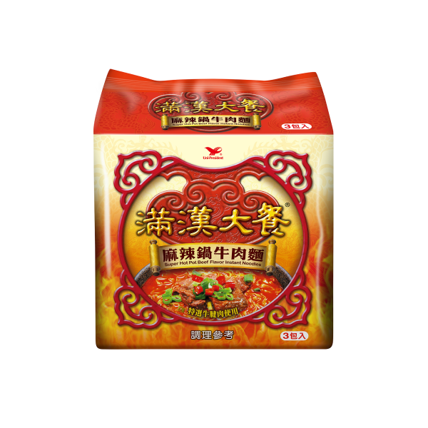 | 內容物(成分) | 麵:麵粉、精製棕櫚油(棕櫚油、抗氧化劑混合濃縮生育醇)、粘稠劑(醋酸澱粉、海藻酸鈉)、水、乳化油(甘油、精製大豆油、水、脂肪酸聚合甘油酯、大豆卵磷脂)、食鹽、小麥蛋白、品質改良用劑(碳酸鉀、多磷酸鈉、無水碳酸鈉)、蛋白粉、複方β-胡蘿蔔素(甘油、中鏈三酸甘油酯、水、脂肪酸聚合甘油酯、抗氧化劑維生素E、β-胡蘿蔔素)、抗氧化劑混合濃縮生育醇(含精製芥花油)。 調味粉包:食鹽、味精、蔗糖、香料、牛肉風味粉〔麥芽糊精、食鹽、醬油、棕櫚油、調味劑(味精、5'-次黃嘌呤核苷磷酸二鈉、5'-鳥嘌呤核苷磷酸二鈉、琥珀酸二鈉、DL-胺基丙酸、胺基乙酸)、牛抽出物、菜籽油、葡萄糖、D-木糖、香料〕、氯化鉀、酵母抽出粉(酵母抽出物、食鹽、葵花油)、魚類蛋白質水解物、焦糖色素、葡萄糖、脫水青蔥、花椒粉、調味劑(5'-次黃嘌呤核苷磷酸二鈉、5'-鳥嘌呤核苷磷酸二鈉、琥珀酸二鈉)、脫水辣椒、蒜粉、酵母抽出粉(酵母抽出物、麥芽糊精)、玉米糖膠、磷酸鈣。 調味油包:精製棕櫚油(棕櫚油、抗氧化劑混合濃縮生育醇)、辣豆瓣醬(辣椒、大豆、食鹽、水、米)、薑、蒜、花椒、香料、辣椒抽出物(辣椒、精製大豆油)、紅椒色素(精製芥花油、紅椒抽出物)。 料理包:水、牛肉(巴拉圭、紐西蘭、澳洲)、精製棕櫚油(棕櫚油、抗氧化劑混合濃縮生育醇)、樹薯澱粉、青蔥、辣豆瓣醬(辣椒、大豆、食鹽、水、米)、酒釀(糯米、水)、蒜、薑、紅椒色素(精製芥花油、紅椒抽出物)、八角。(固形量25公克,內容量105公克) |