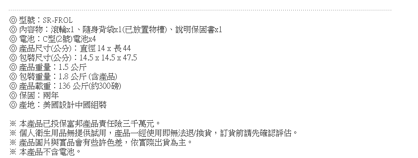 產品載重:136公斤(約300磅内容物:滾輪xl、隨身背袋x1(已放置物槽)、說明保固書x1