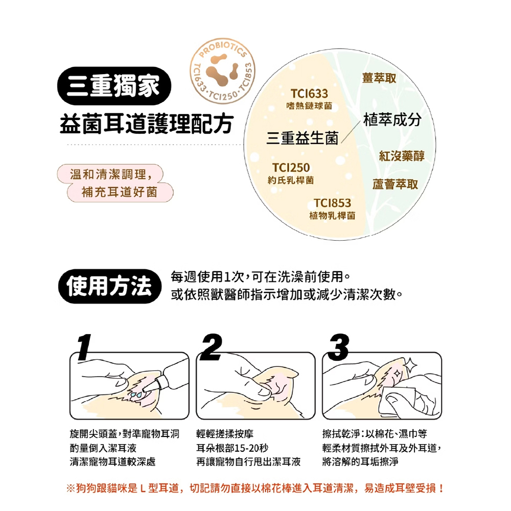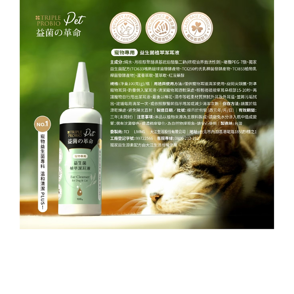 ●注意事項:1.請避免噴灑至人或寵物黏膜處,避免刺激2.僅供寵物用品清潔使用。本品以植物來源為主原料製成,請避免水分滲入瓶中造成變質;偶有沈澱變色,或濃稠度變化,為自然物理現象,請安心使用。請置於嬰幼童無法取得處,避免誤食。