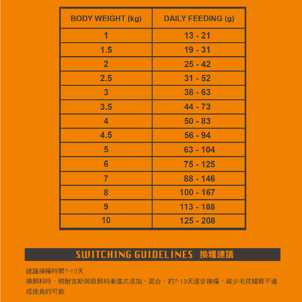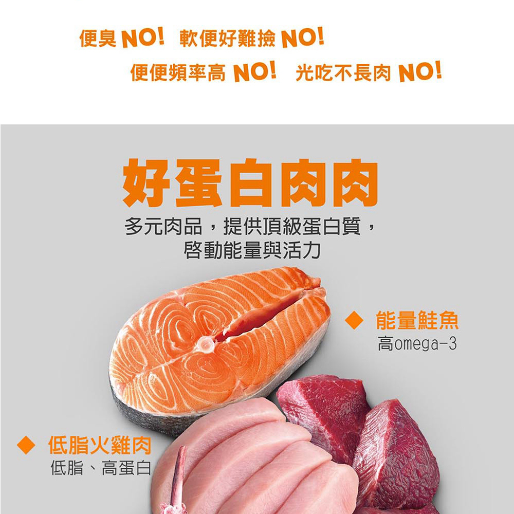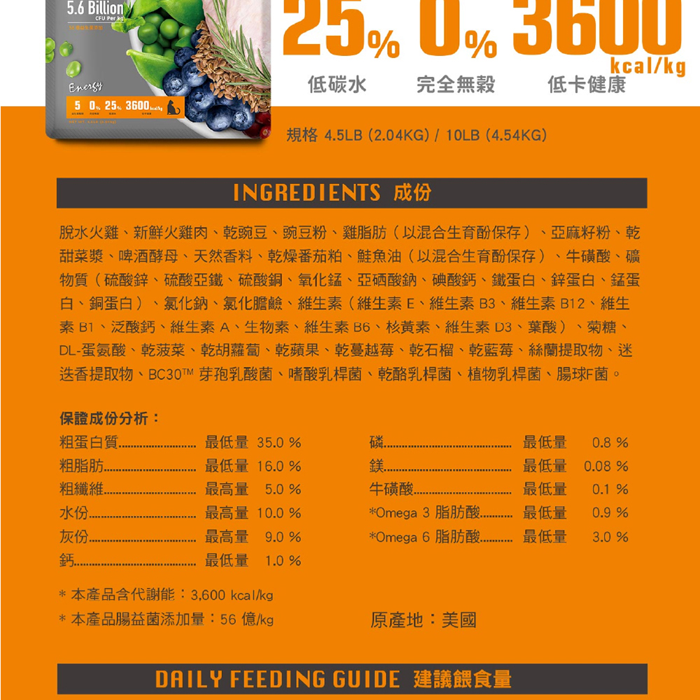 ●主成分:脫水火雞、新鮮火雞肉、乾豌豆、豌豆粉、雞脂肪(以混合生育酚保存)、亞麻籽粉、乾甜菜漿、啤酒酵母、天然香料、乾燥番茄粕、鮭魚油(以混合生育酚保存)、牛磺酸、礦物質(硫酸鋅、硫酸亞鐵、硫酸銅、氧化錳、亞硒酸鈉、碘酸鈣、鐵蛋白、鋅蛋白、錳蛋白、銅蛋白)、氯化鈉、氯化膽鹼、維生素(維生素 E、維生素 B3、維生素 B12、維生素 B1、泛酸鈣、維生素 A、生物素、維生素 B6、核黃素、維生素 D3、葉酸)、菊糖、DL-蛋氨酸、乾菠菜、乾胡蘿蔔、乾蘋果、乾蔓越莓、乾石榴、乾藍莓、絲蘭提取物、迷迭香提取物、BC30TM 芽孢乳酸菌、嗜酸乳桿菌、乾酪乳桿菌、植物乳桿菌、腸球F菌。